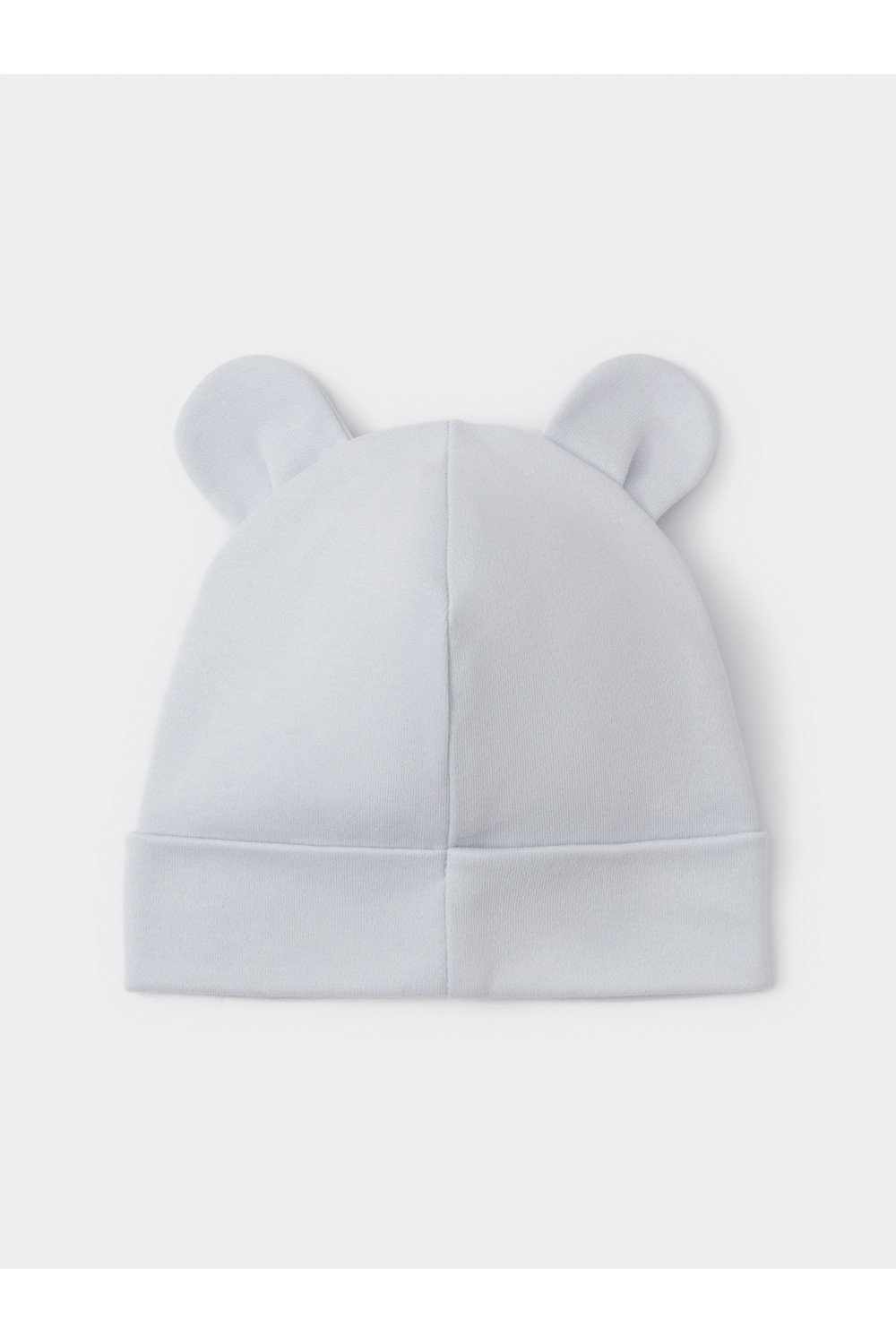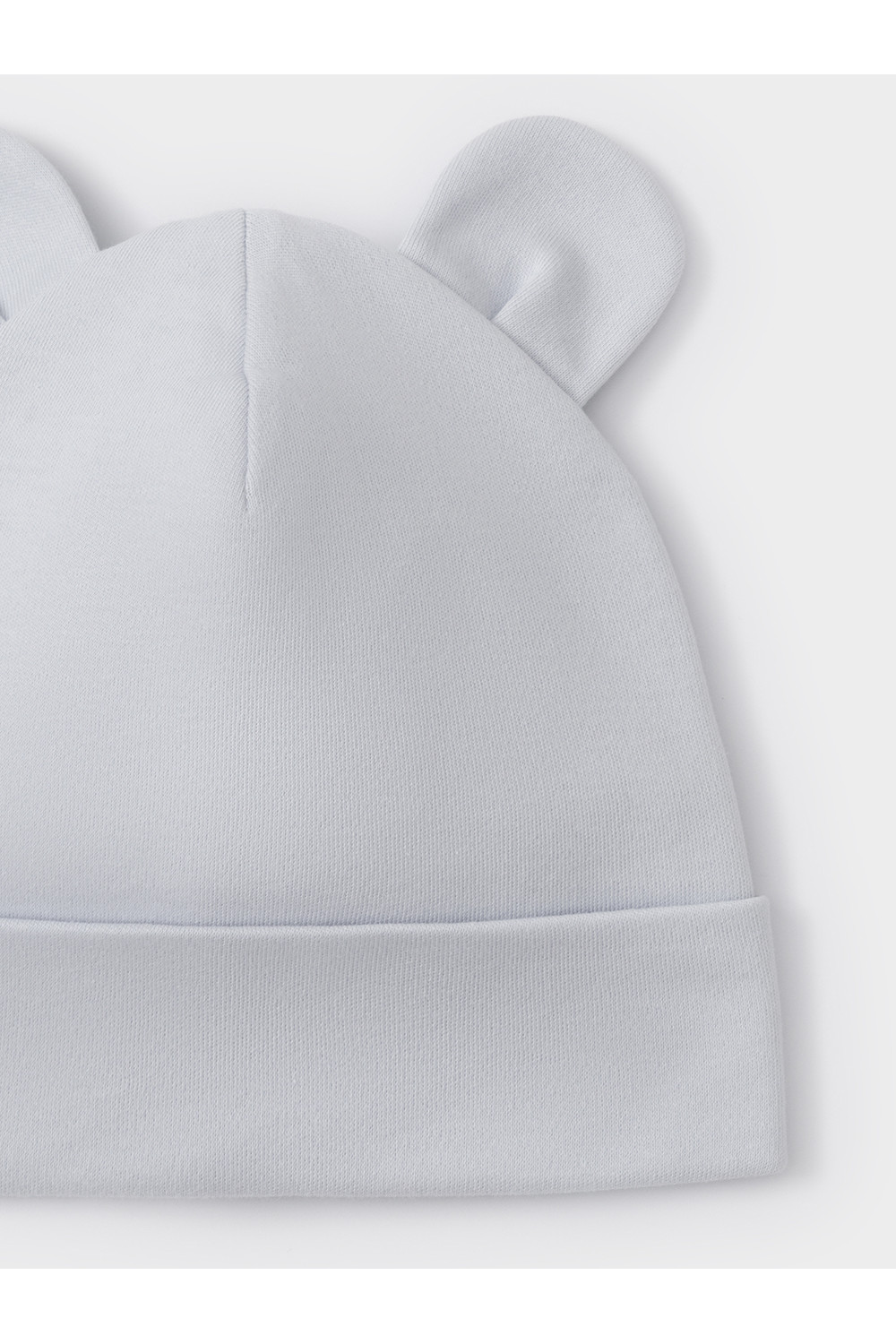 Шапка с отворотом для новорождённых из мягкого эластичного трикотажа интерлок, произведённого из натурального хлопка. Украшена декоративными ушками. Все трикотажные полотна производятся в соответствии с нормами швейцарского сертификата ЭкоТекс.