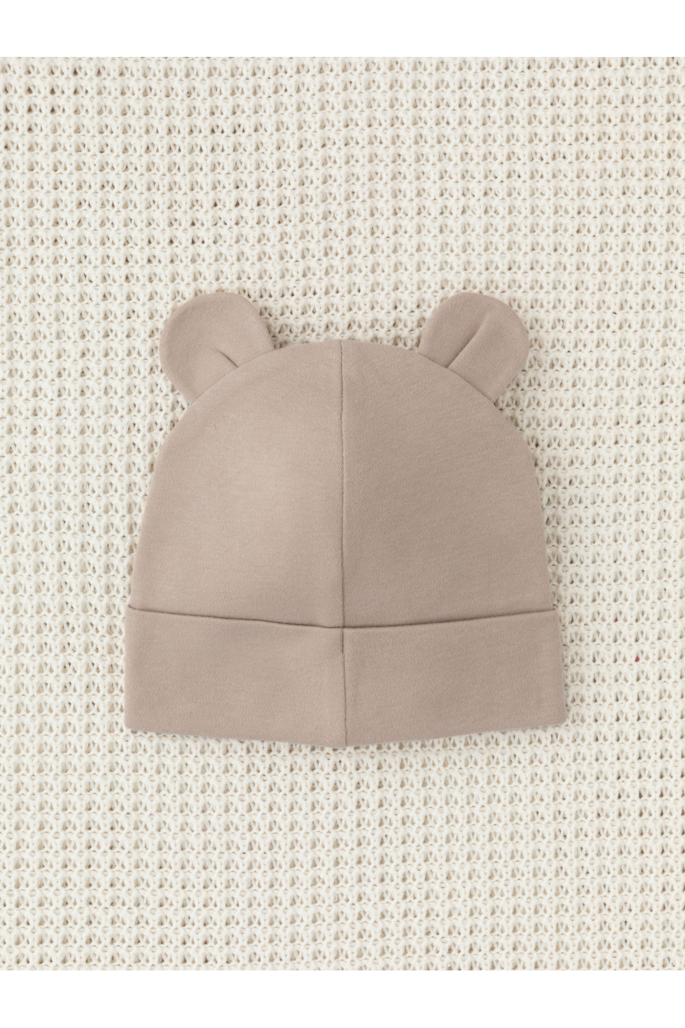 Шапка с отворотом для новорождённых из мягкого эластичного трикотажа интерлок, произведённого из натурального хлопка. Украшена декоративными ушками. Все трикотажные полотна производятся в соответствии с нормами Швейцарского сертификата ЭкоТекс.
