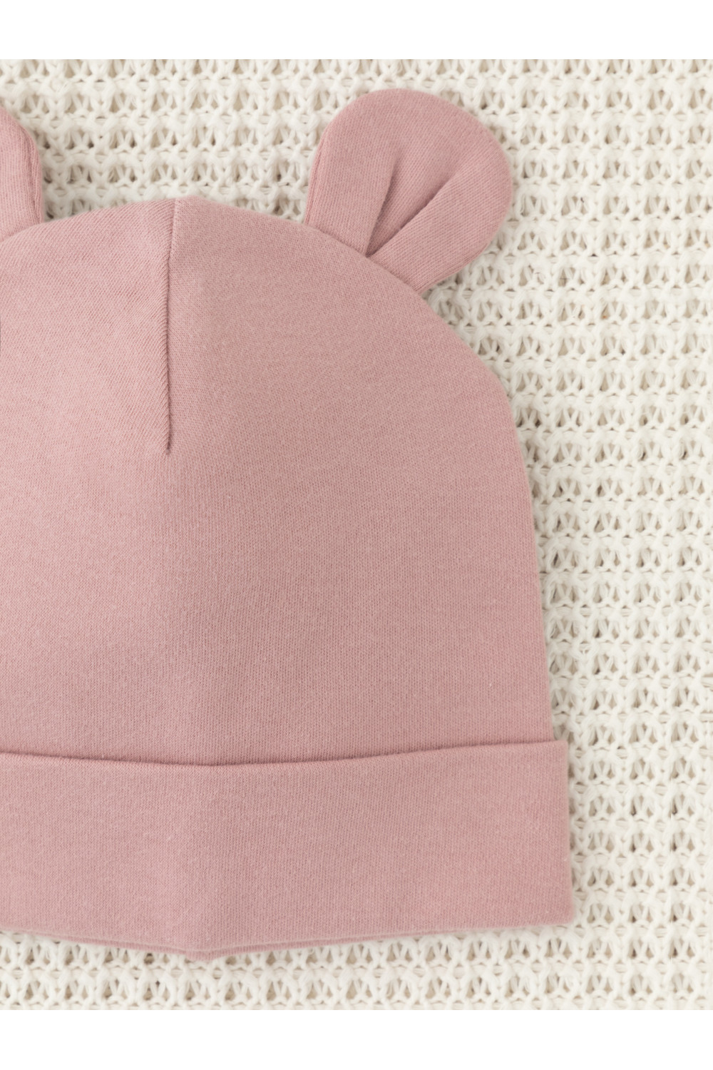 Шапка с отворотом для новорождённых из мягкого эластичного трикотажа интерлок, произведённого из натурального хлопка. Украшена декоративными ушками. Все трикотажные полотна производятся в соответствии с нормами Швейцарского сертификата ЭкоТекс.