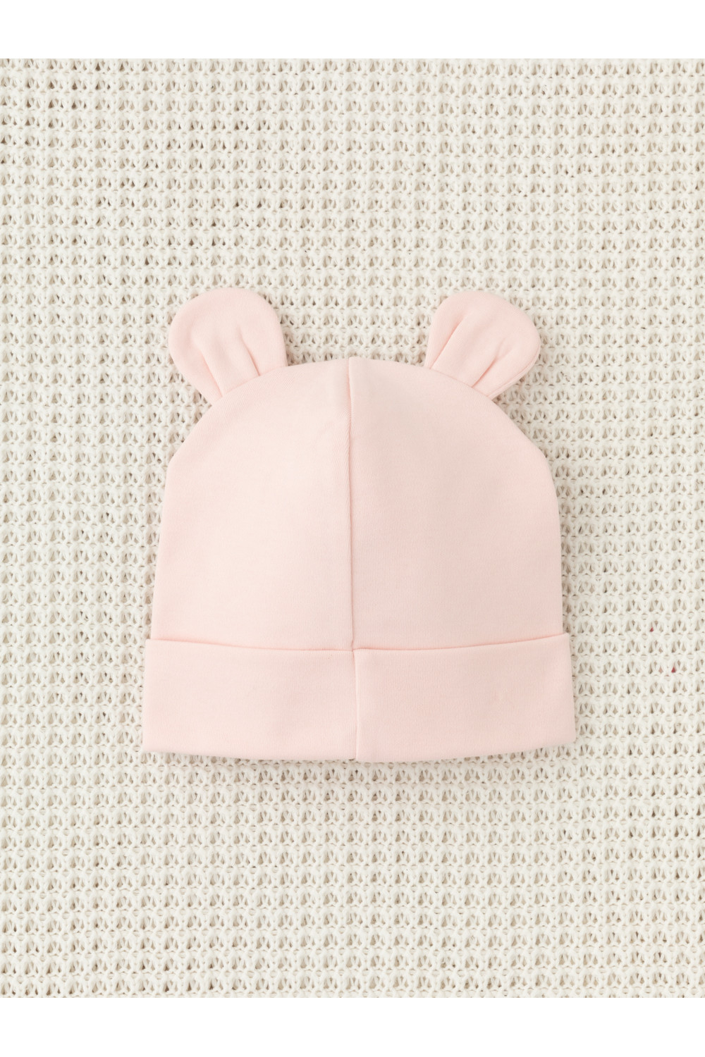 Шапка с отворотом для новорождённых из мягкого эластичного трикотажа интерлок, произведённого из натурального хлопка. Украшена декоративными ушками. Все трикотажные полотна производятся в соответствии с нормами Швейцарского сертификата ЭкоТекс.