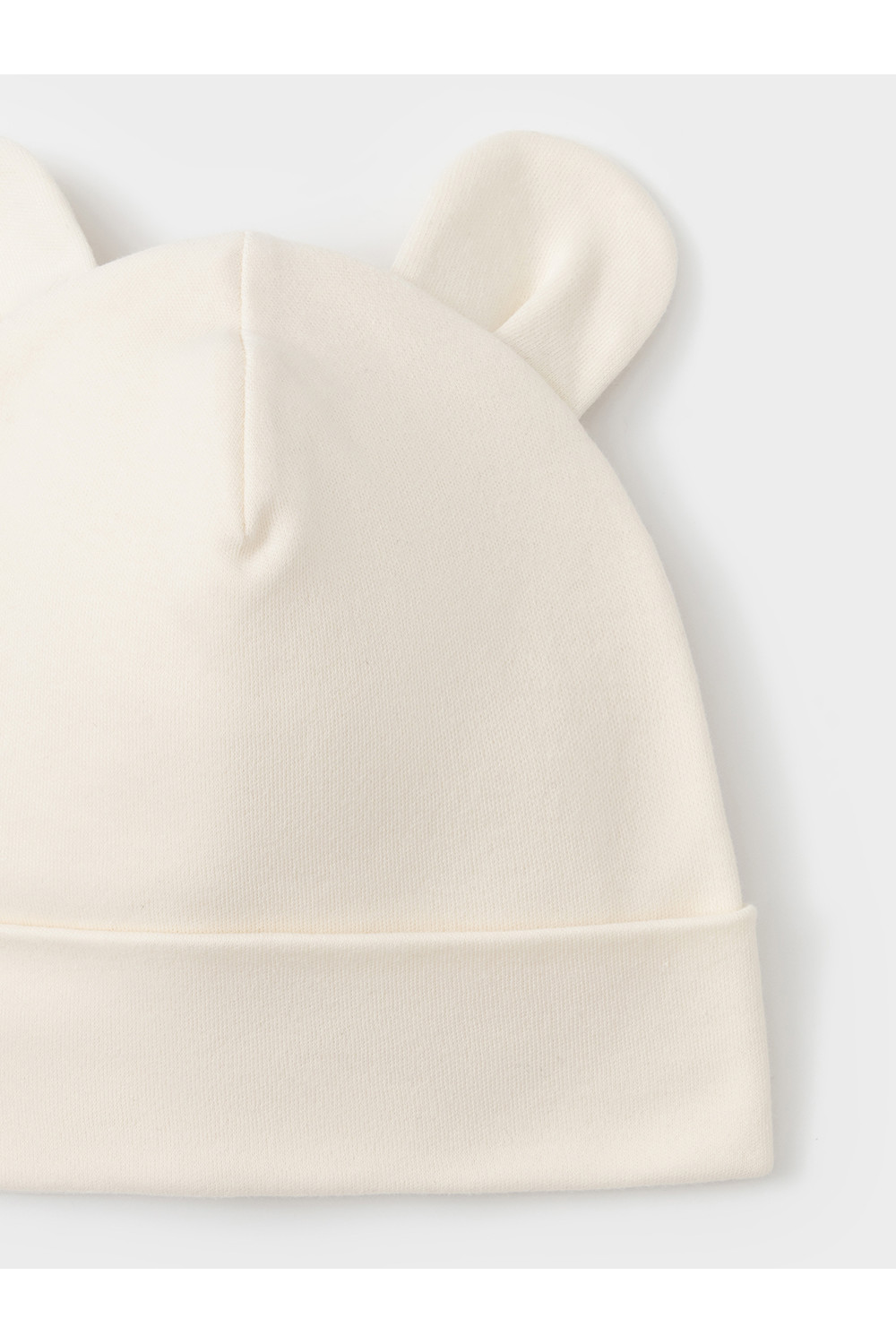 Шапка с отворотом для новорождённых из мягкого эластичного трикотажа интерлок, произведённого из натурального хлопка. Украшена декоративными ушками. Все трикотажные полотна производятся в соответствии с нормами швейцарского сертификата ЭкоТекс.