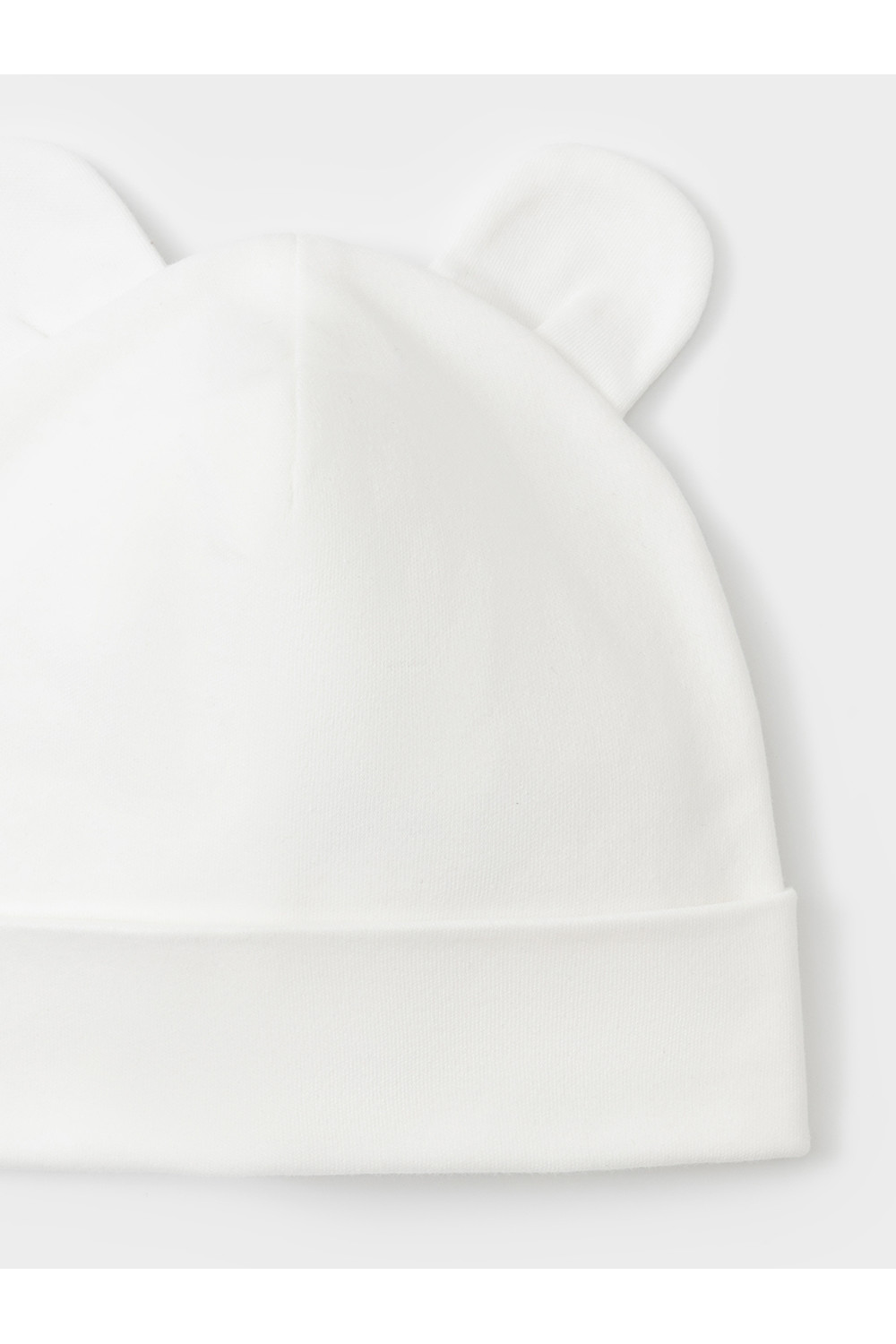 Шапка с отворотом для новорождённых из мягкого эластичного трикотажа интерлок, произведённого из натурального хлопка. Украшена декоративными ушками. Все трикотажные полотна производятся в соответствии с нормами швейцарского сертификата ЭкоТекс.