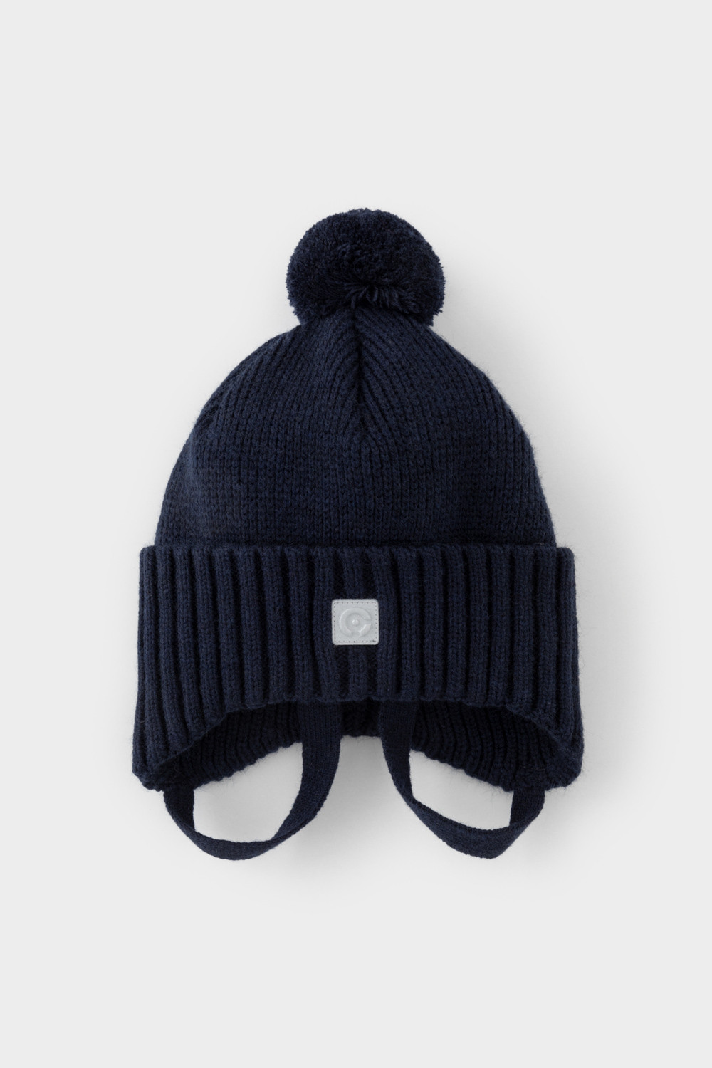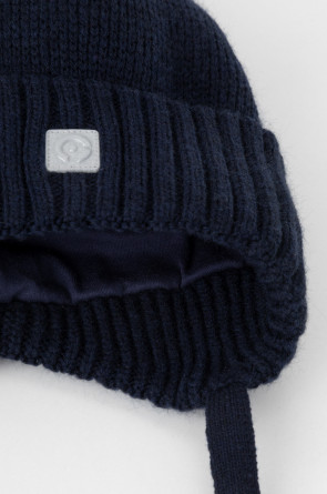 Тёплая зимняя шапка с подкладом из хлопкового трикотажа. Верх выполнен из полушерстяной пряжи. На макушке помпон. Светоотражающая нашивка спереди обеспечивает безопасность в темное время суток.