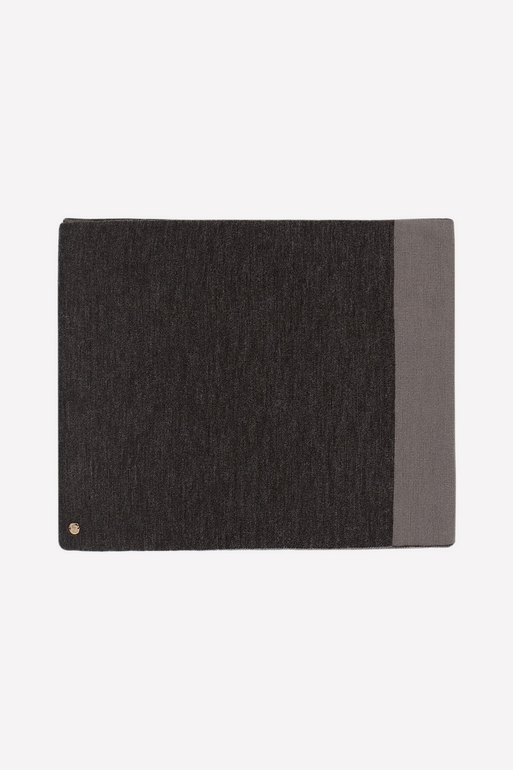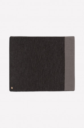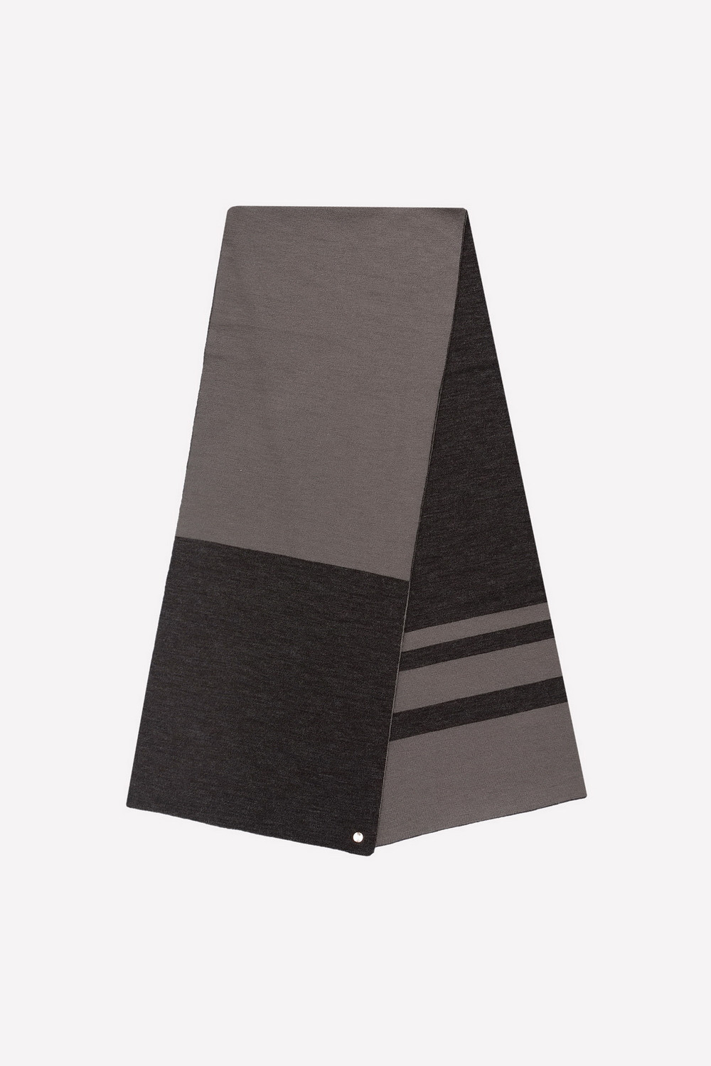Двусторонний шарф из полушерсти с вывязанным рисунком в виде разновеликих полос. Длина - 200 см, ширина - 40 см. Связан гладью. Украшен тиснённым значком из металла и фирменной этикеткой.