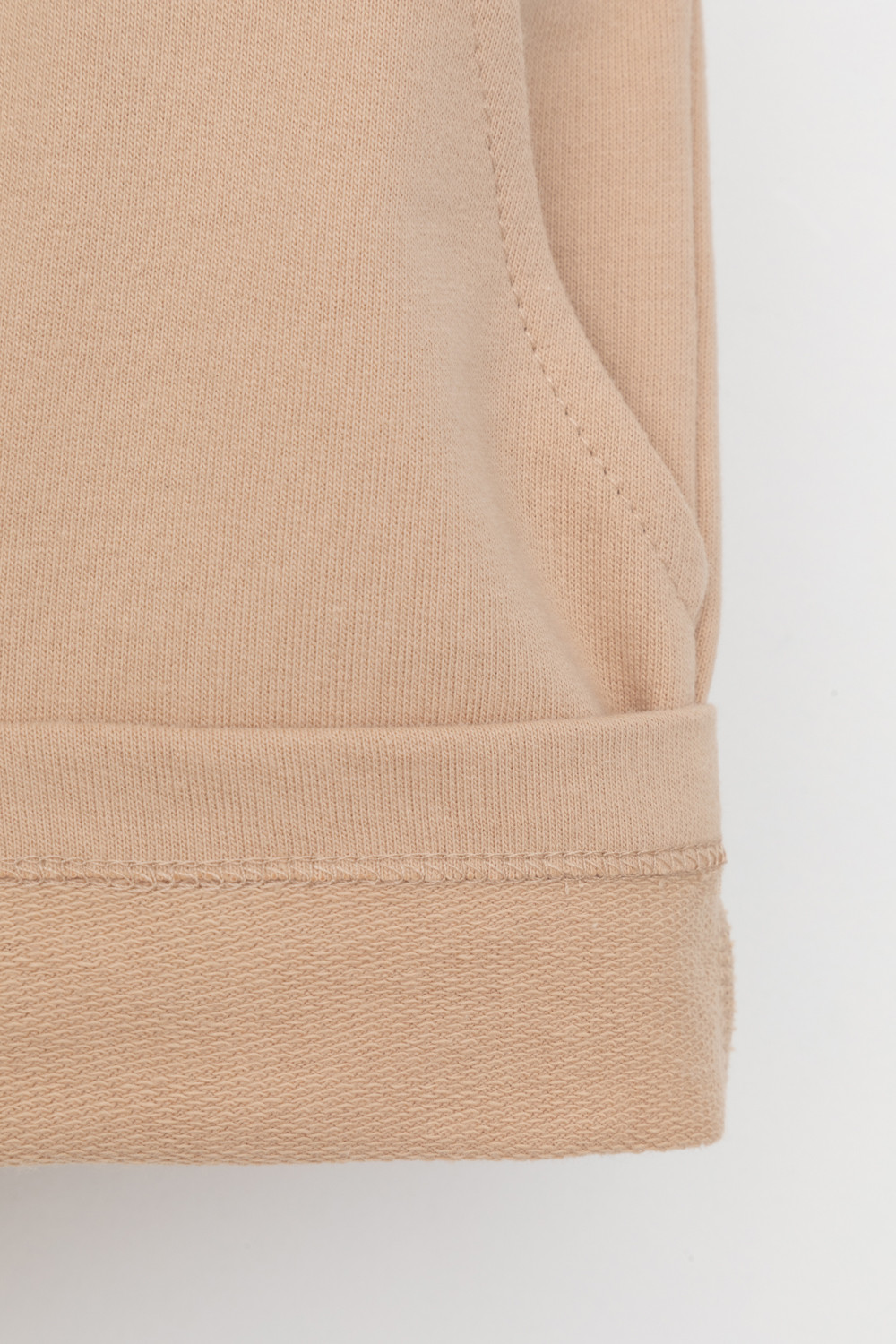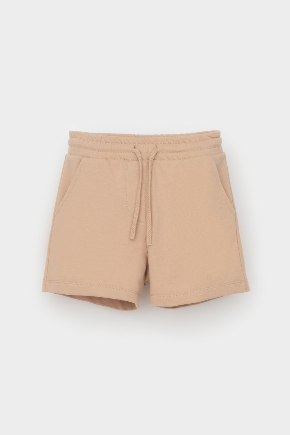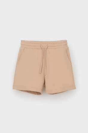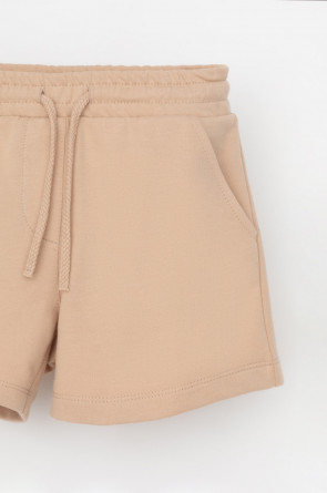 Трикотажные шорты для девочки из петельчатого футера. Эластичный пояс на резинке регулируется по ширине с помощью шнурка, по бокам два удобных кармана.