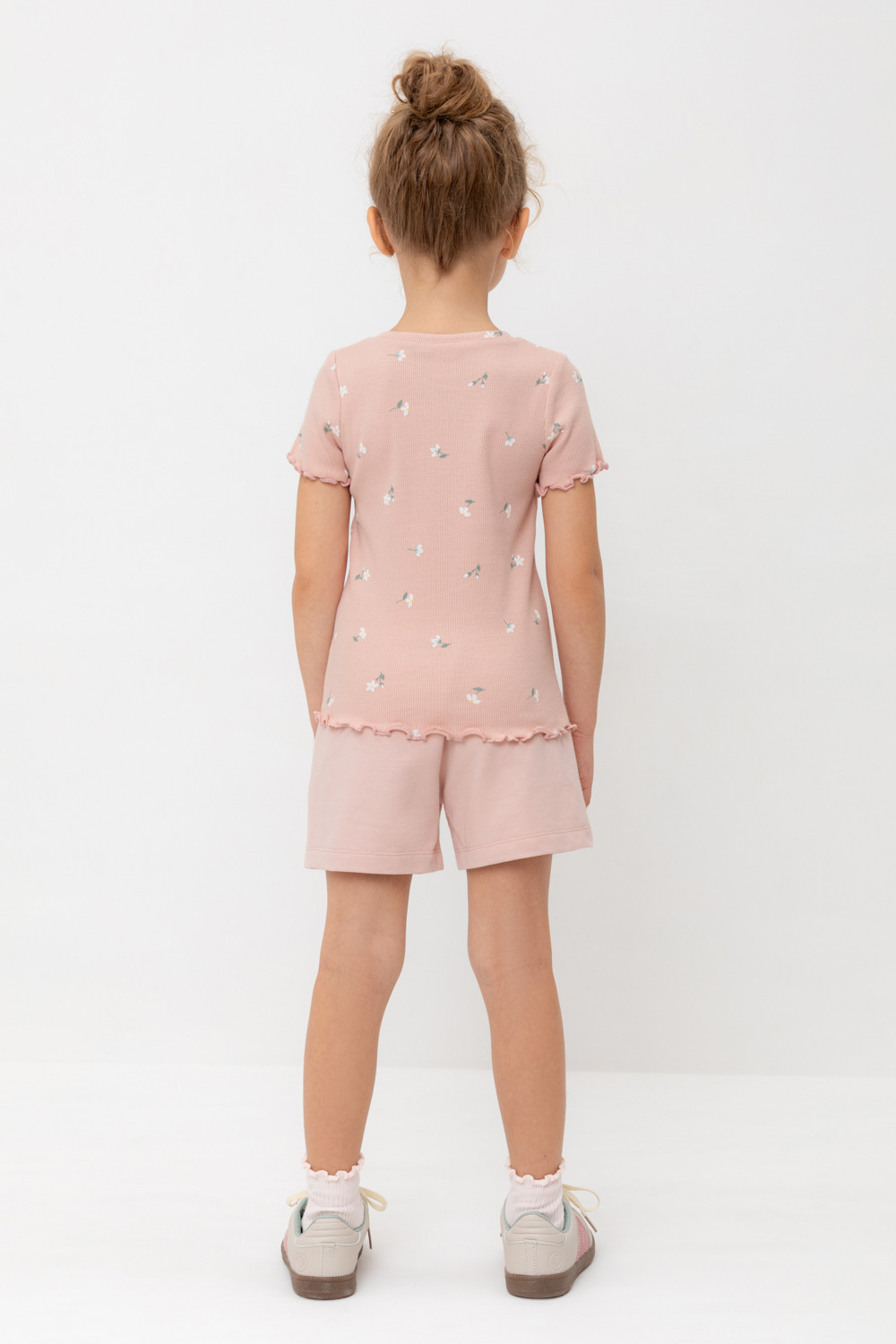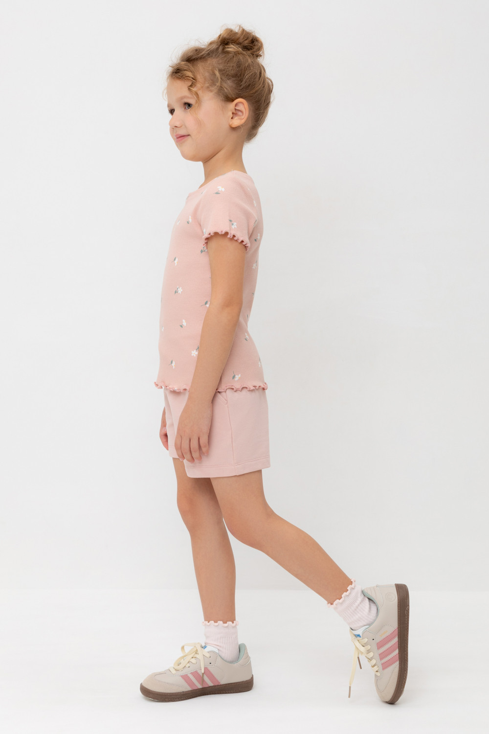 Трикотажные шорты для девочки из петельчатого футера. Эластичный пояс на резинке регулируется по ширине с помощью шнурка, по бокам два удобных кармана.