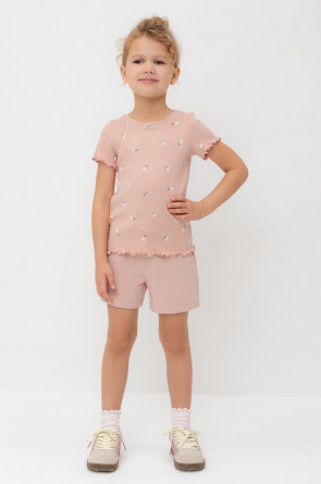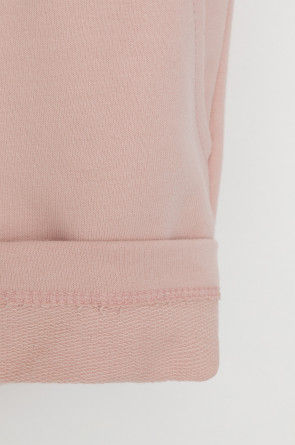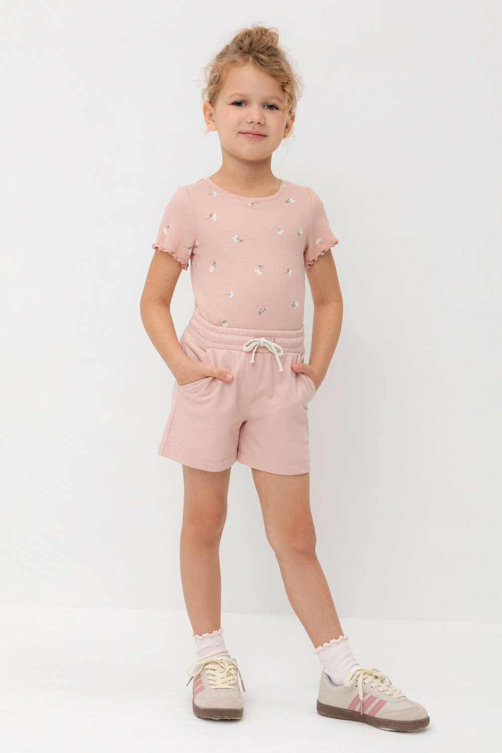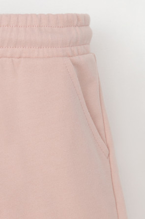 Трикотажные шорты для девочки из петельчатого футера. Эластичный пояс на резинке регулируется по ширине с помощью шнурка, по бокам два удобных кармана.