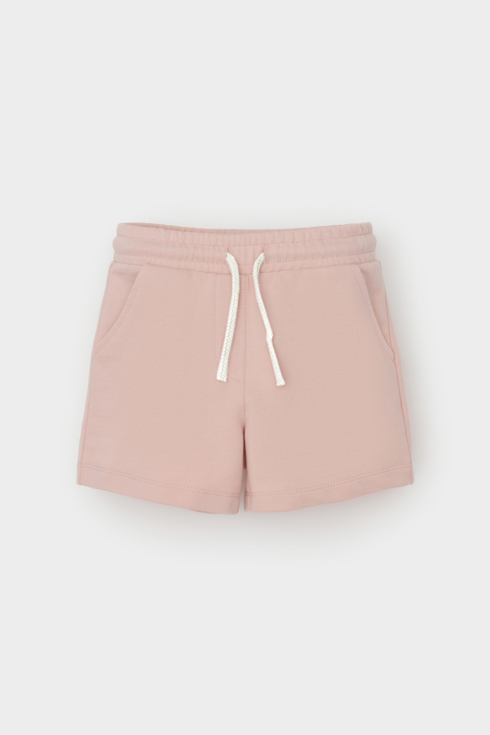 Трикотажные шорты для девочки из петельчатого футера. Эластичный пояс на резинке регулируется по ширине с помощью шнурка, по бокам два удобных кармана.