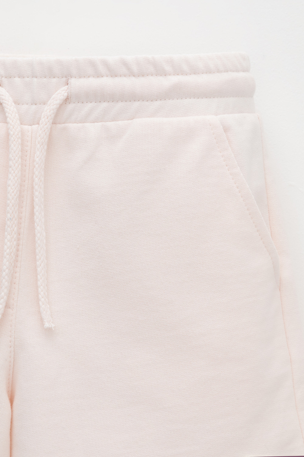 Трикотажные шорты для девочки из петельчатого футера. Эластичный пояс на резинке регулируется по ширине с помощью шнурка, по бокам два удобных кармана.