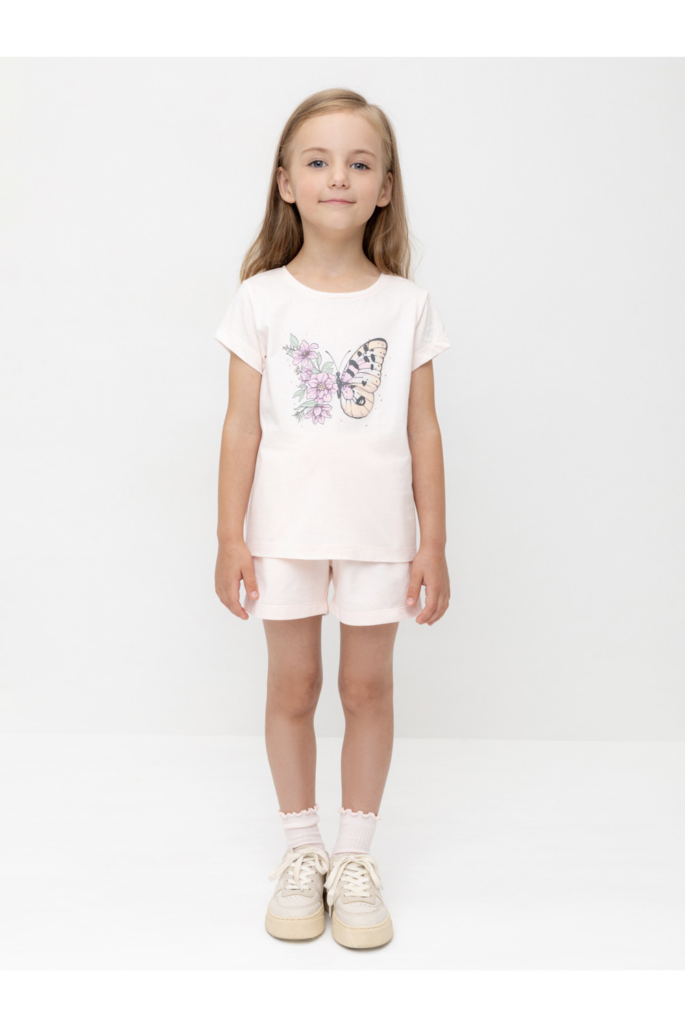 Трикотажные шорты для девочки из петельчатого футера. Эластичный пояс на резинке регулируется по ширине с помощью шнурка, по бокам два удобных кармана.