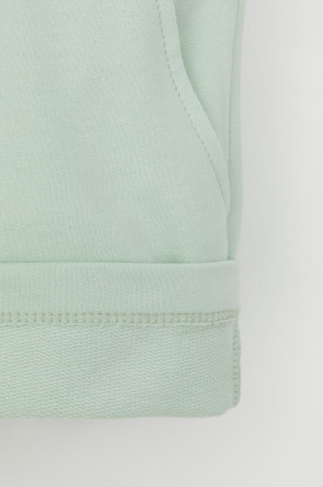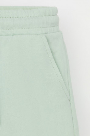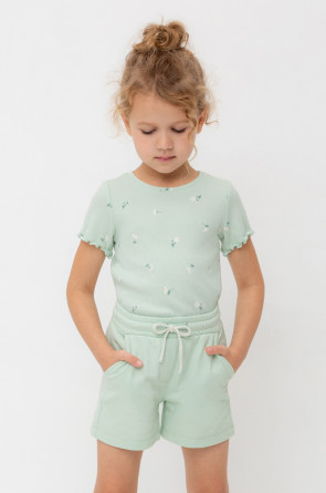 Трикотажные шорты для девочки из петельчатого футера. Эластичный пояс на резинке регулируется по ширине с помощью шнурка, по бокам два удобных кармана.