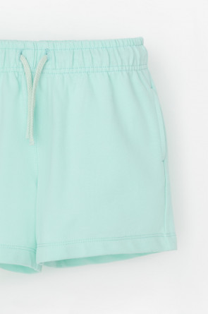 Трикотажные шорты для девочки свободного кроя из петельчатого футера. Эластичный пояс на резинке регулируется по ширине с помощью шнурка, по бокам два удобных кармана.