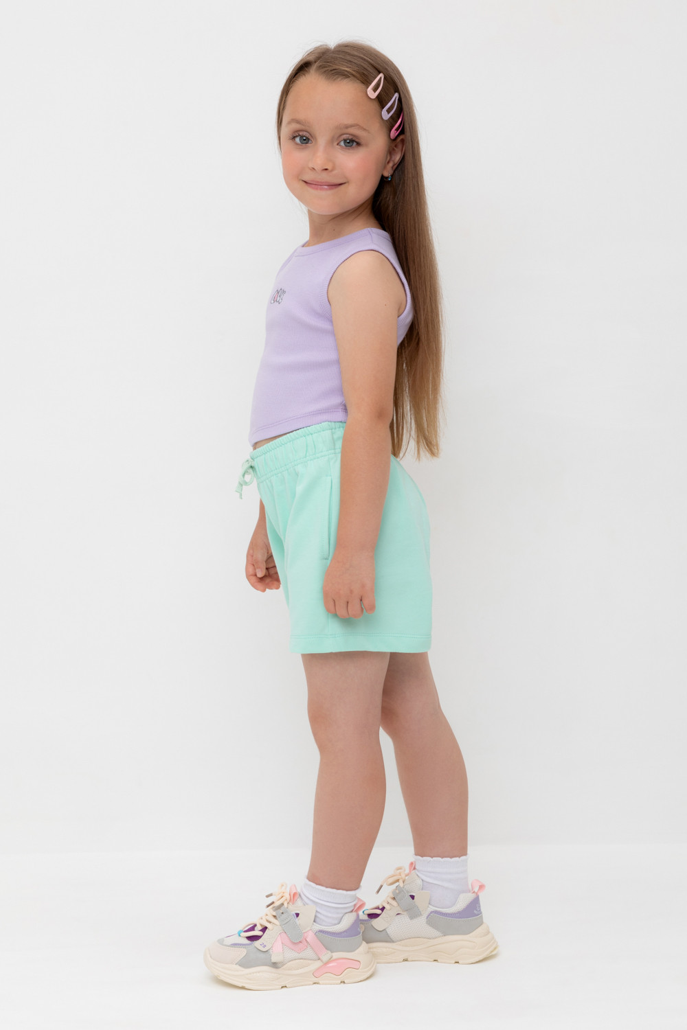 Трикотажные шорты для девочки свободного кроя из петельчатого футера. Эластичный пояс на резинке регулируется по ширине с помощью шнурка, по бокам два удобных кармана.
