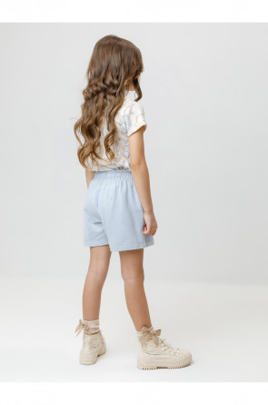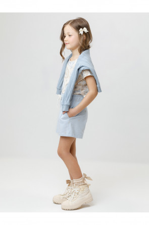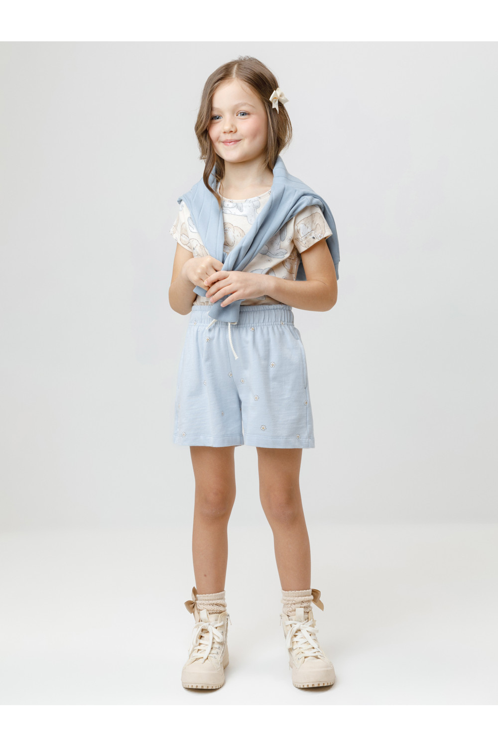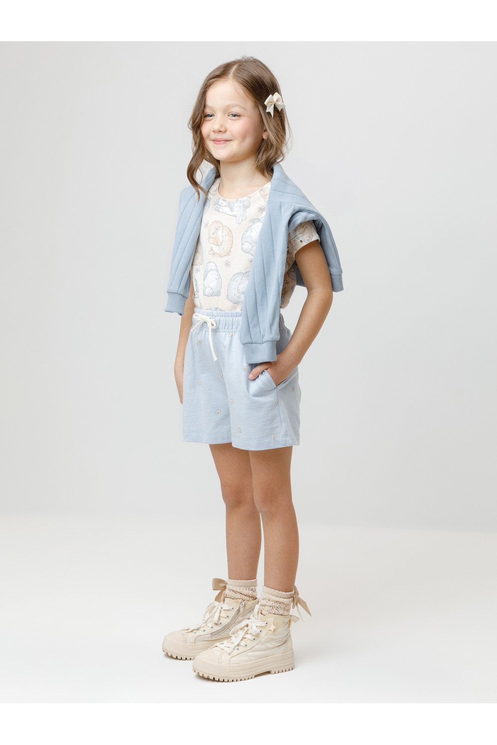 Трикотажные шорты для девочки свободного кроя из петельчатого футера. Эластичный пояс на резинке регулируется по ширине с помощью шнурка, по бокам два удобных кармана.