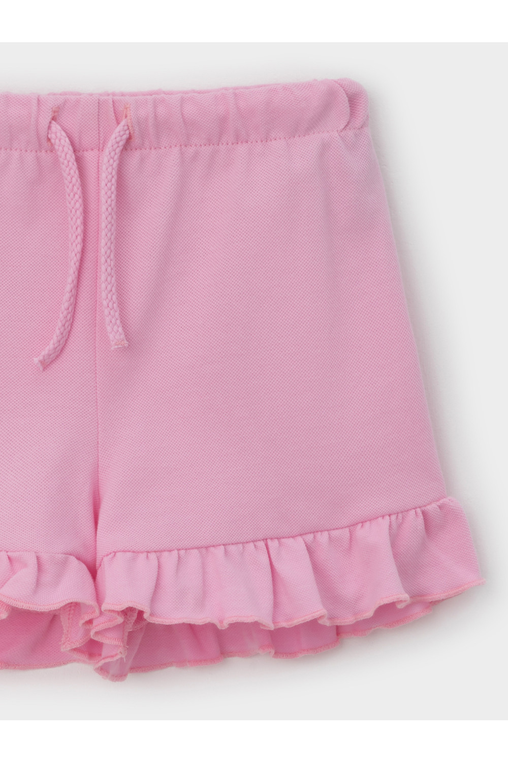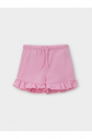 Лёгкие шорты для девочки из мягкого высококачественного трикотажа пике. Эластичный пояс на резинке регулируется по ширине с помощью шнурка. Низ украшен рюшами. Изделие сохраняет цвет и форму после многократных стирок. Все трикотажные полотна производятся в соответствии с нормами швейцарского сертификата ЭкоТекс.