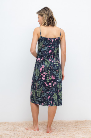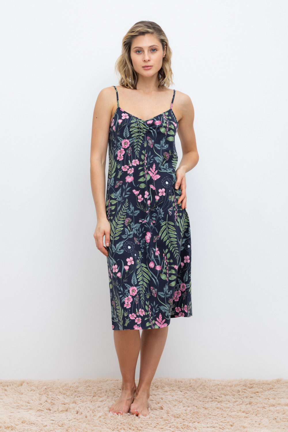 Элегантная сорочка на бретелях из 100% натурального хлопка для комфортного сна. Модель из трикотажного полотна супрем с набивным нежным рисунком с регулируемыми бретелями. На груди сборка. Гладкий материал приятен к телу и позволяет коже дышать.