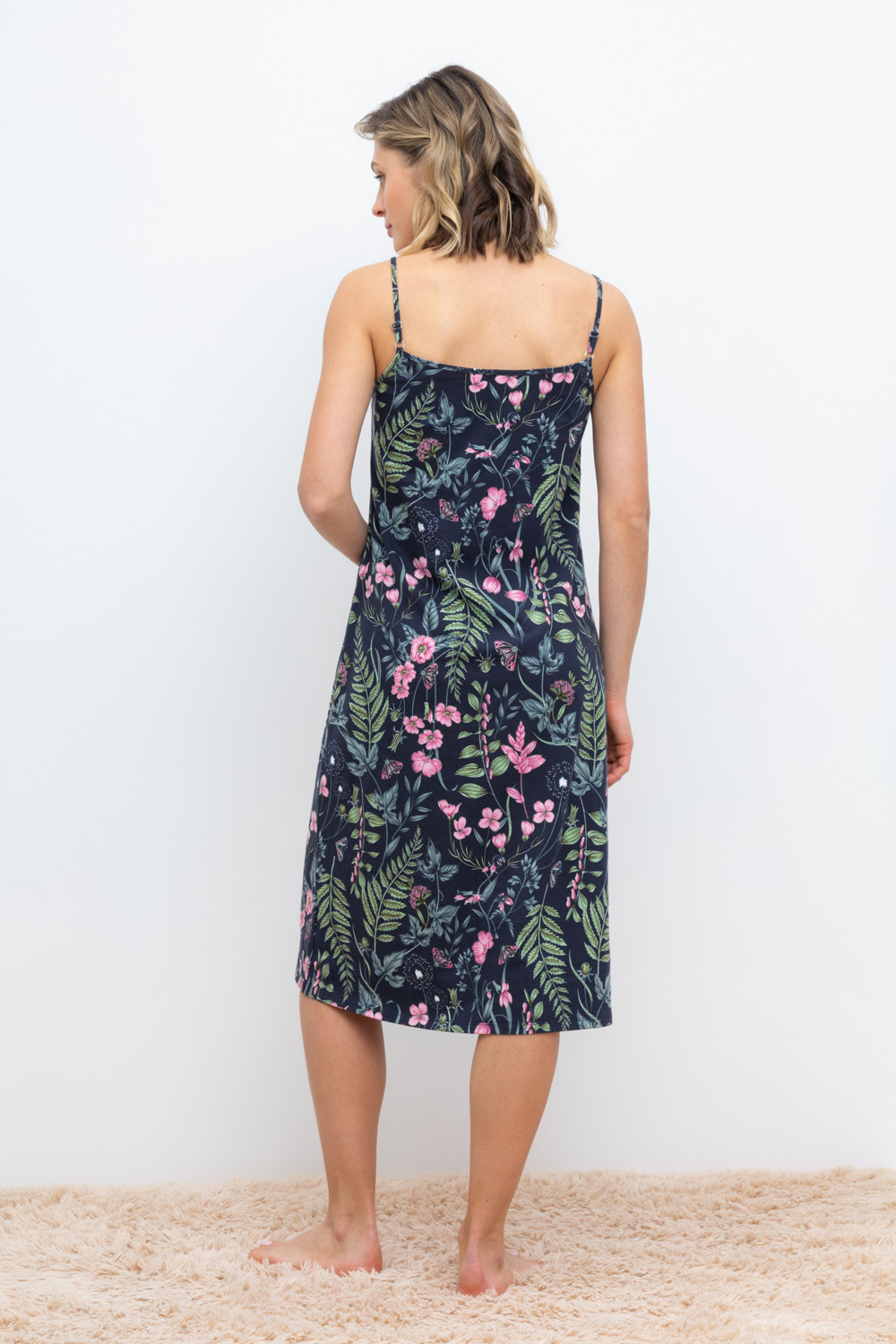 Элегантная сорочка на бретелях из 100% натурального хлопка для комфортного сна. Модель из трикотажного полотна супрем с набивным нежным рисунком с регулируемыми бретелями. На груди сборка. Гладкий материал приятен к телу и позволяет коже дышать.