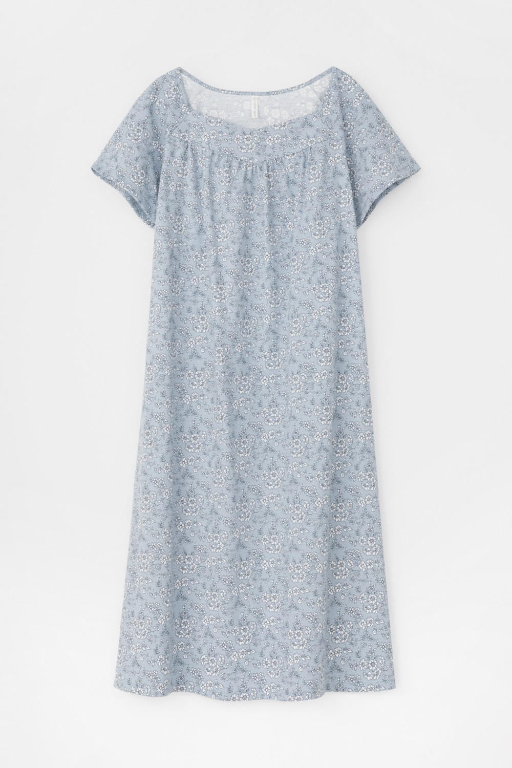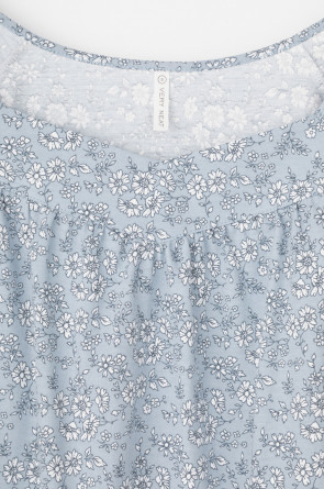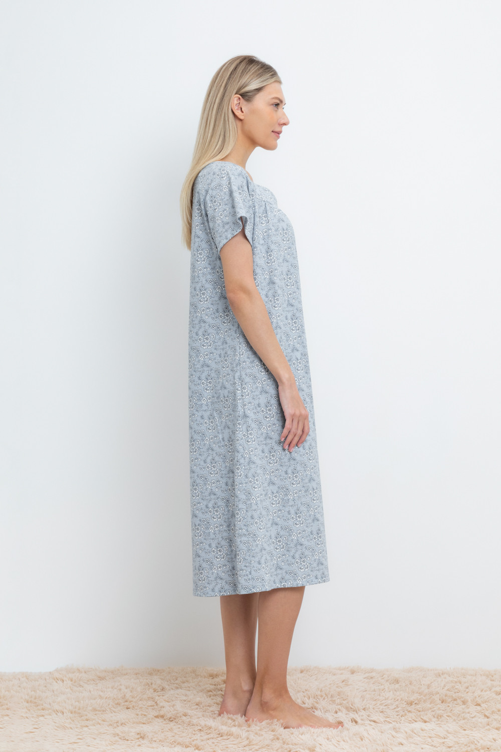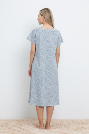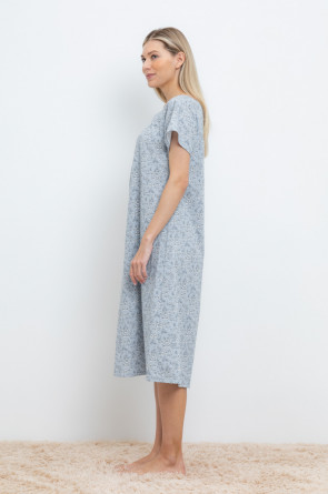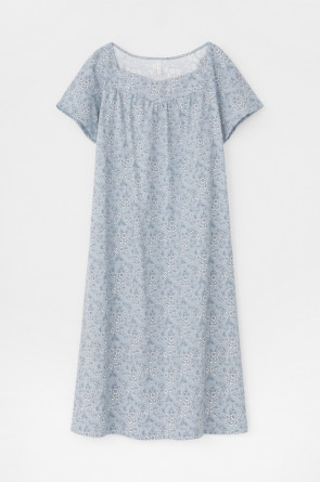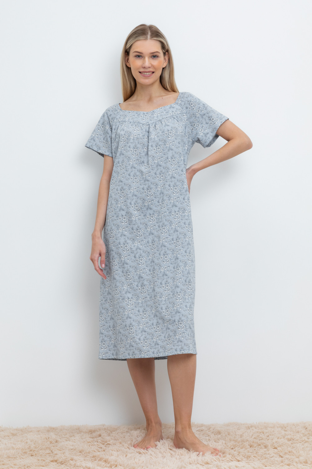 Уютная сорочка с короткими рукавами из 100% натурального хлопка. Выполнена из набивного трикотажа супрем с нежным рисунком. Кокетка на сборке придает дополнительный объем.