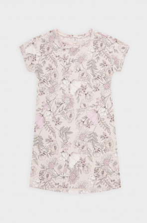 Сорочка для девочки из трикотажного хлопка. Короткие рукава со спущенным плечом. Скругленная спинка оформлена длиннее полочки.