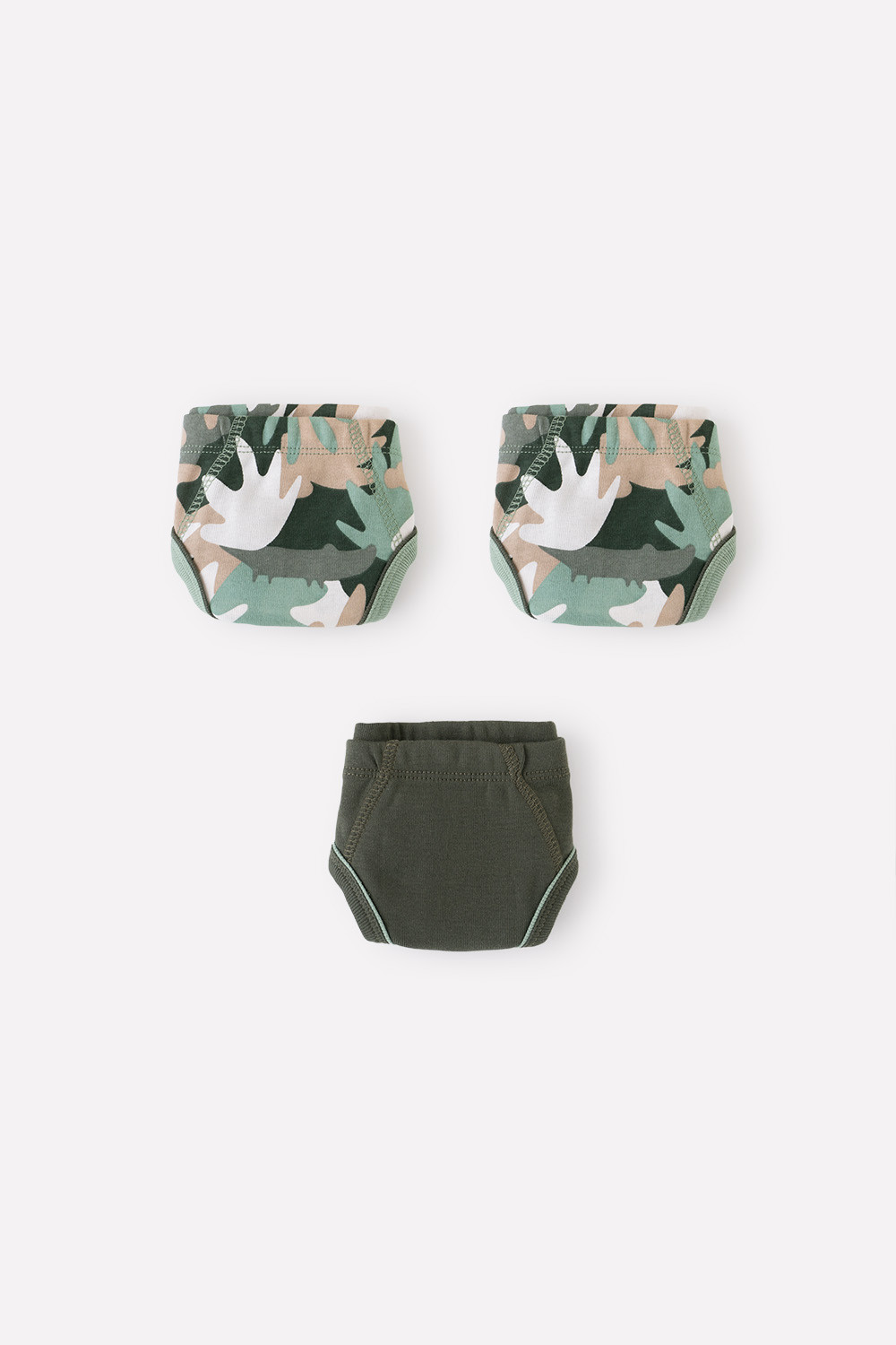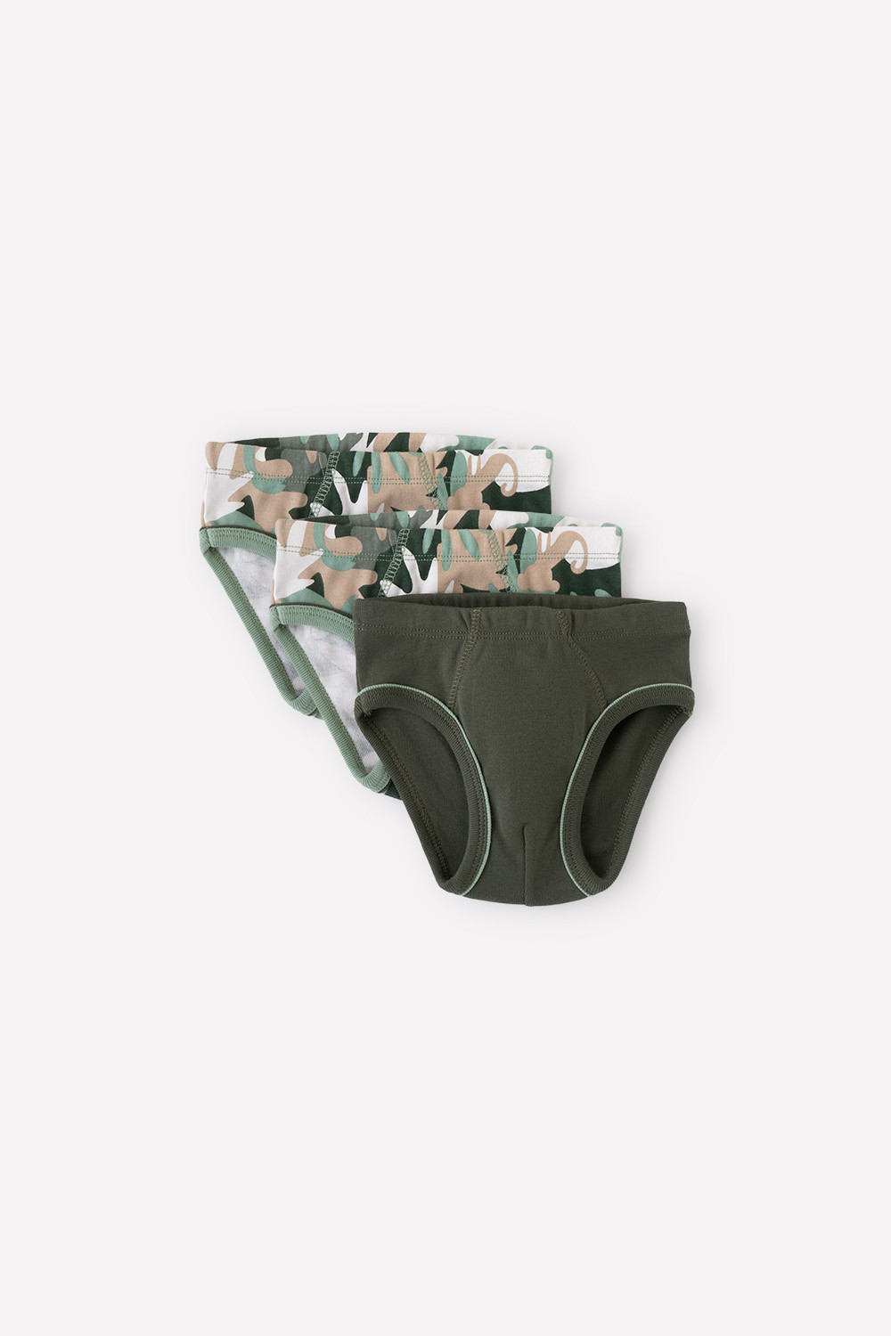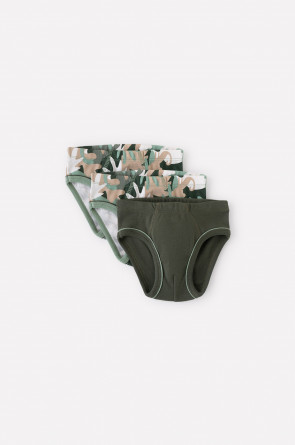 Комплект трусов для мальчика. Сшиты из эластичного материала рибана пенье. В упаковке 3 штуки: зелёный хаки + тропический камуфляж. Проймы обработаны бейкой.