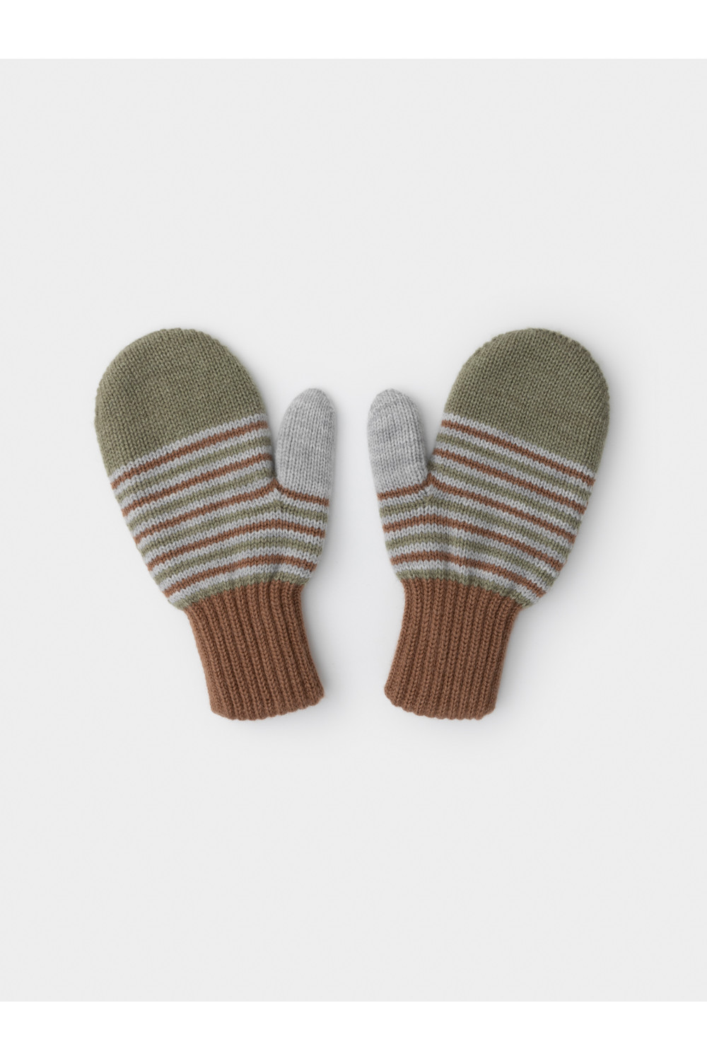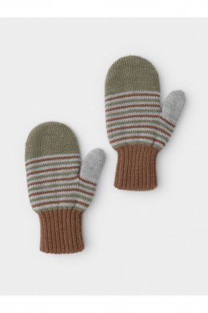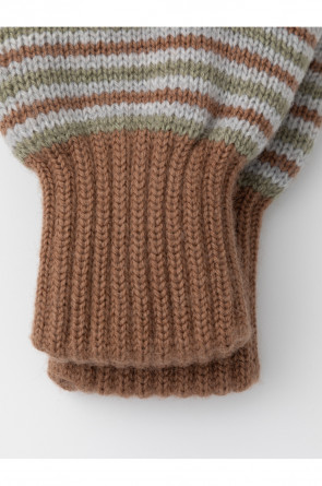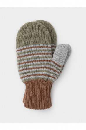 Варежки в полоску из полушерстяной пряжи. Эластичные манжеты фиксируют перчатку на руке.