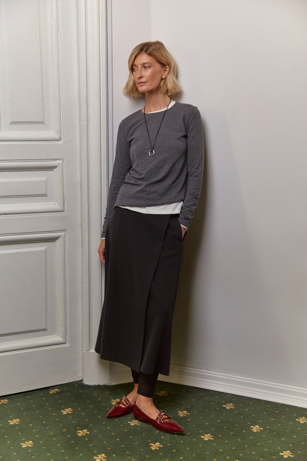 Трикотажная юбка на запах из плотного гладкого трикотажа интерлок, произведенного из высококачественного гребенного хлопка. В составе 80% натурального хлопка и 20% полиэстера, при этом полиэстер ввязан внутрь по особой технологии и не соприкасается с кожей. Изделие сохраняет цвет и форму после многократных стирок.
