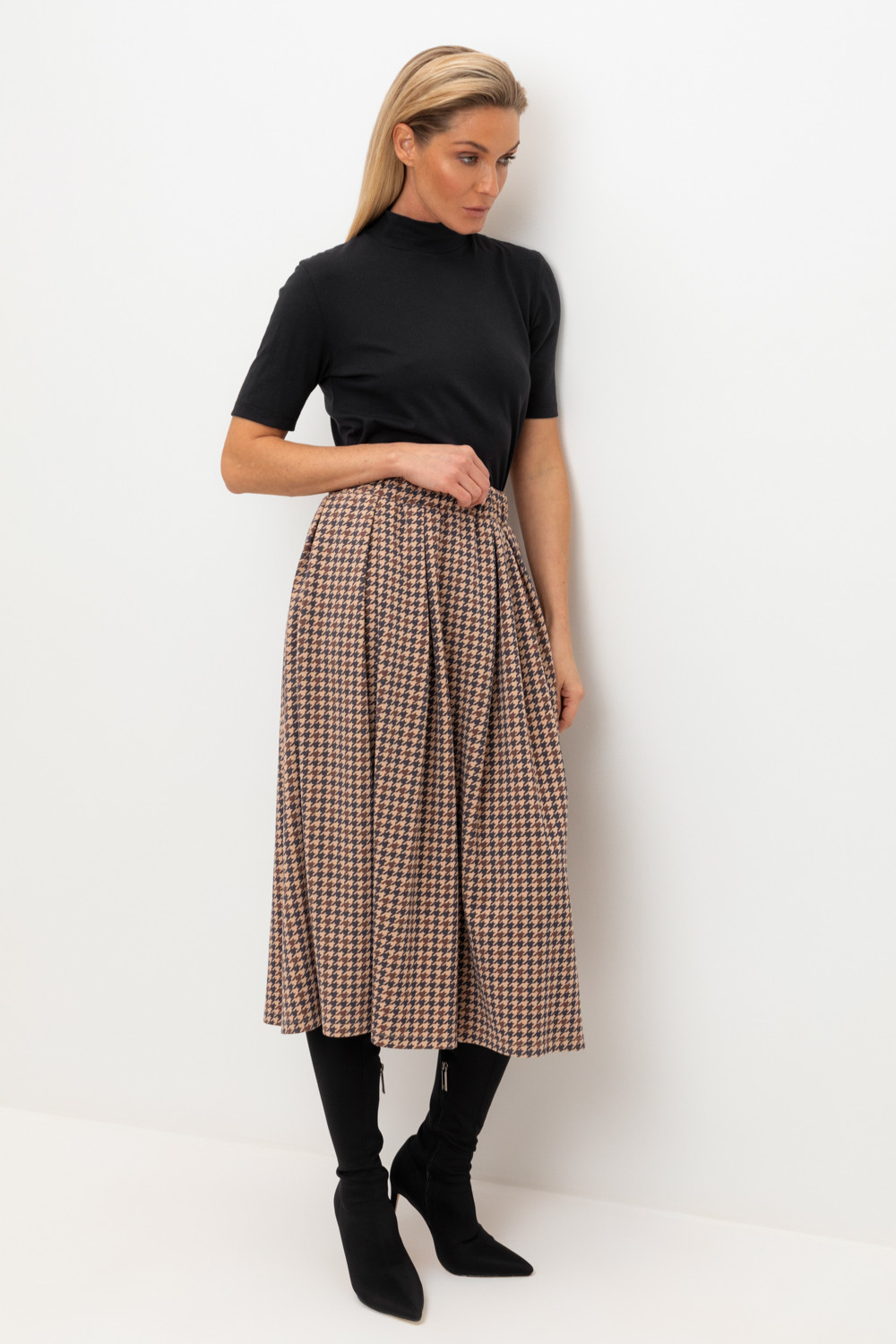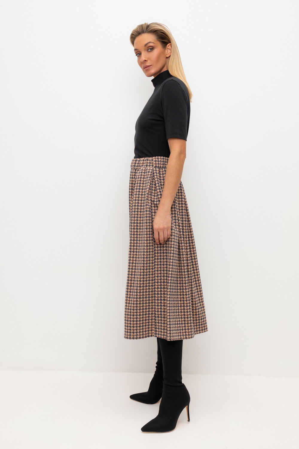 Трикотажная юбка с карманами длины миди из плотного гладкого трикотажа интерлок, произведенного из высококачественного гребенного хлопка. В составе 48% натурального хлопка и 52% полиэстера, при этом полиэстер ввязан внутрь по особой технологии и не соприкасается с кожей. Застегивается на потайную молнию. Изделие сохраняет цвет и форму после многократных стирок.