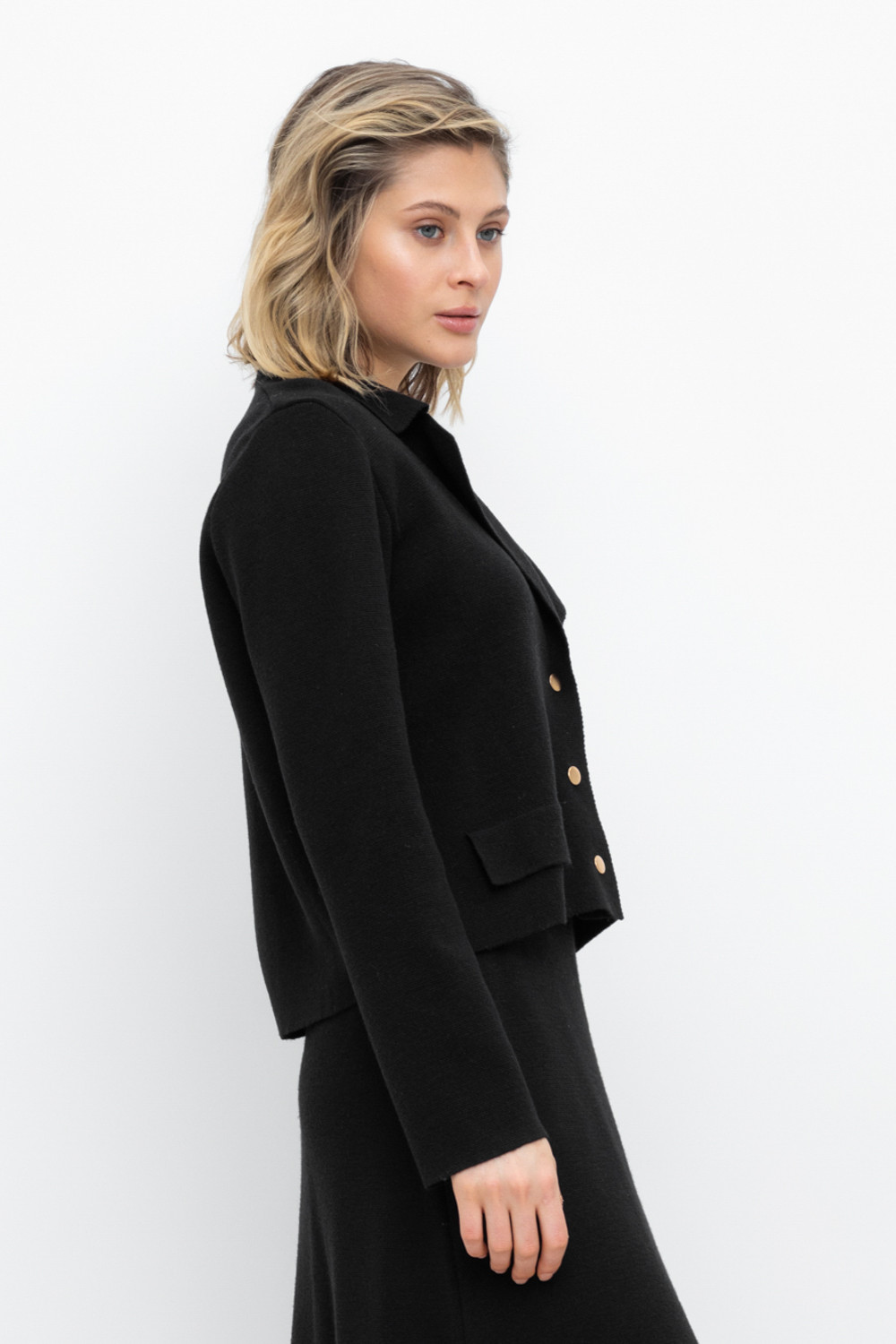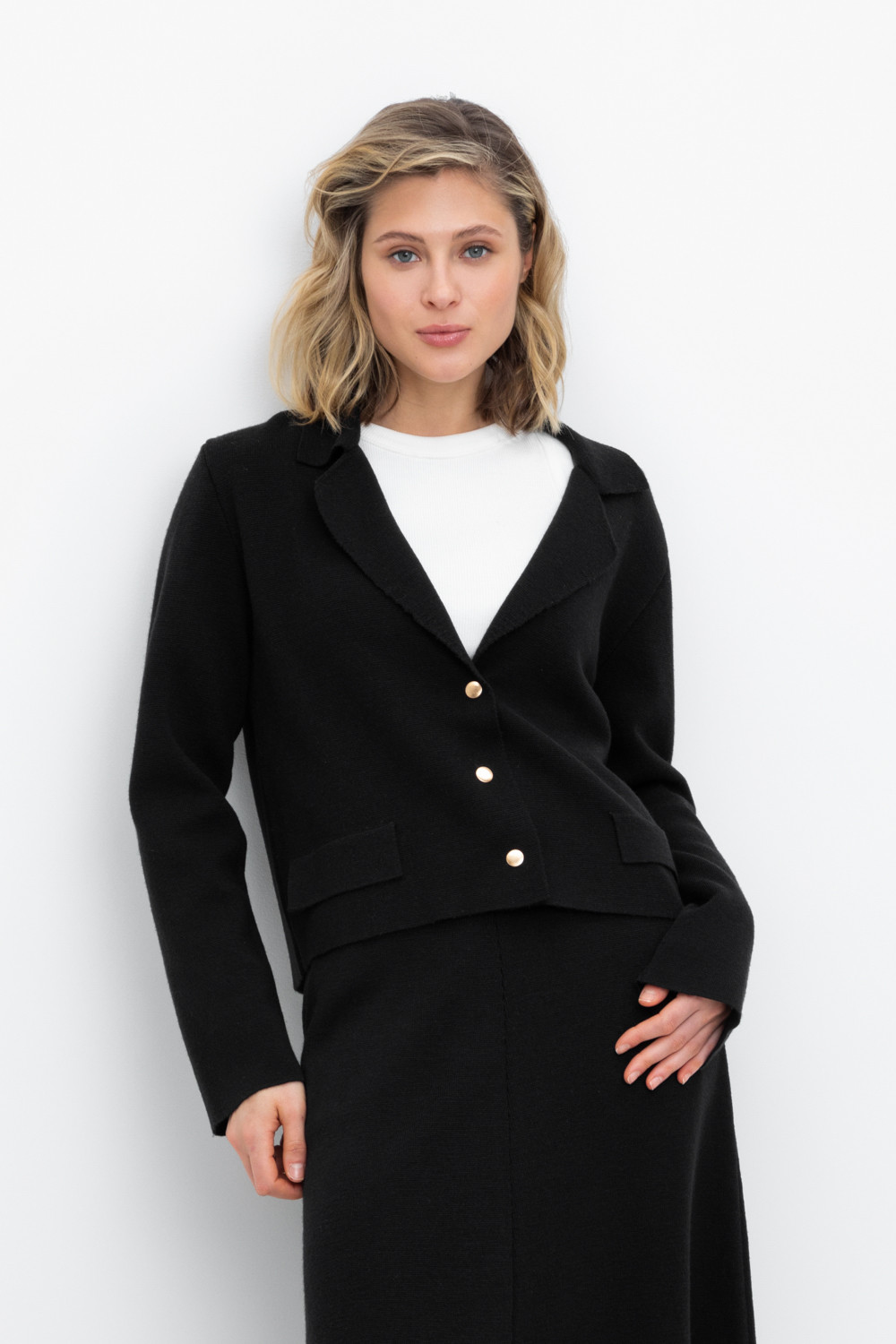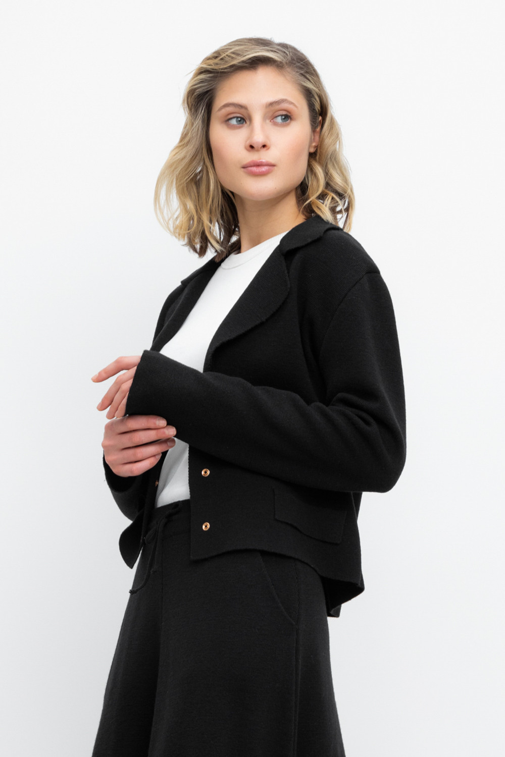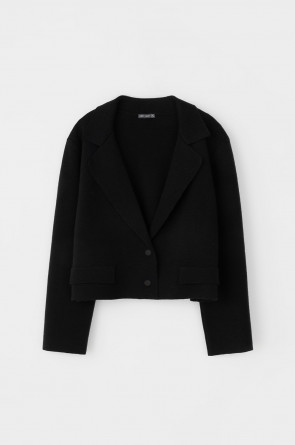 Женский укороченный жакет прямого кроя с имитацией карманов с клапаном, связан комбиниркой. Шерсть мериноса в составе сохраняет тепло, акрил делает изделие мягким. Прямой силуэт идеально подходит как к юбке, так и к брюкам.