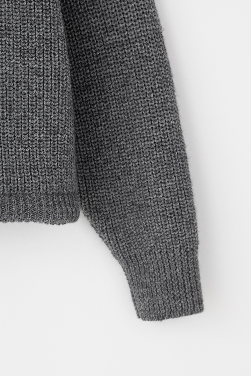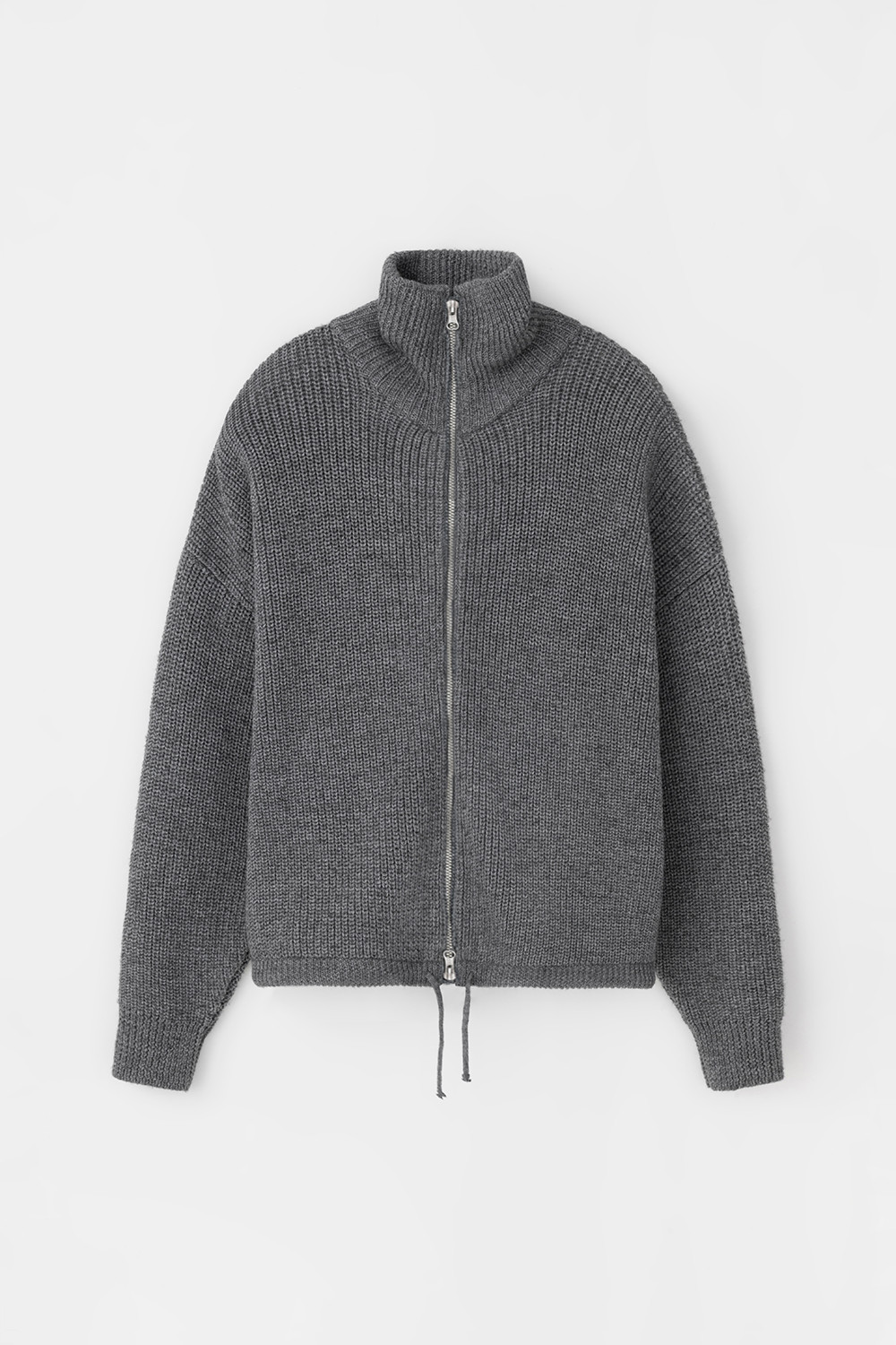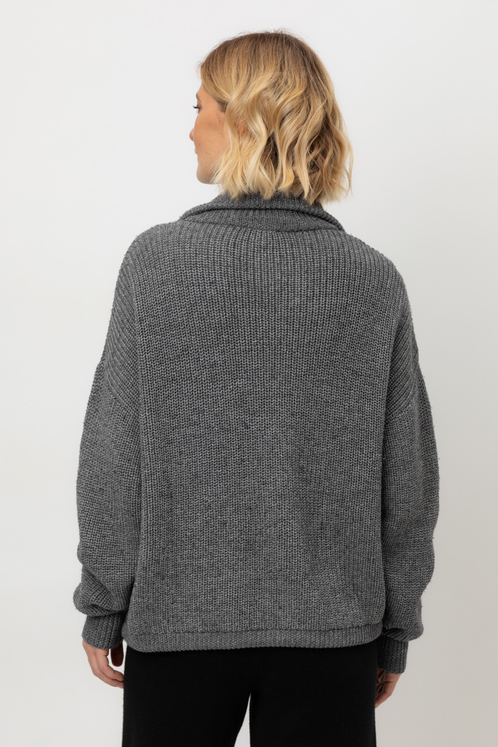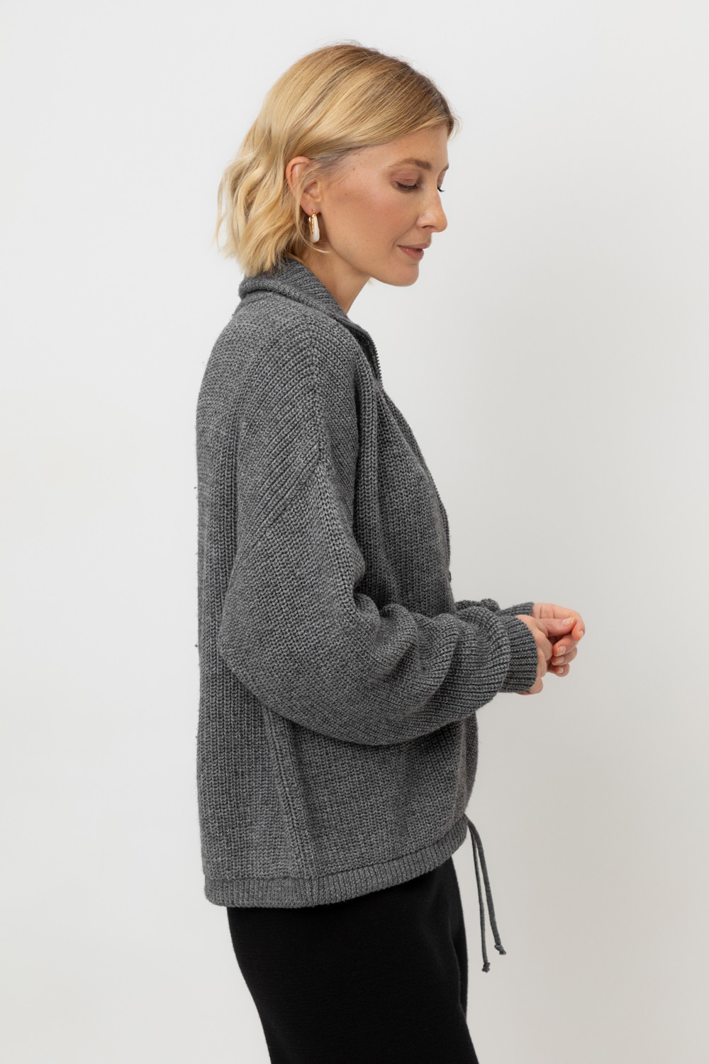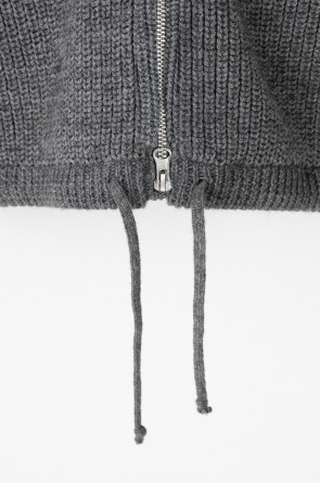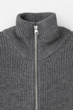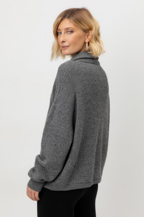 Джемпер вязаный на молнии с объёмными рукавами. Изготовлен из мягкой полушерстяной пряжи. Шерсть в составе сохраняет тепло, акрил делает изделие мягким.