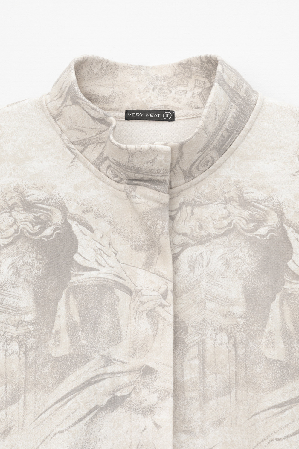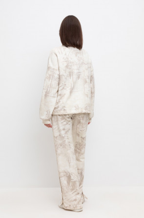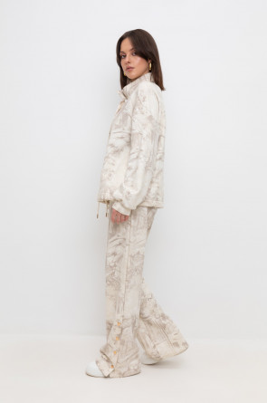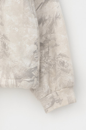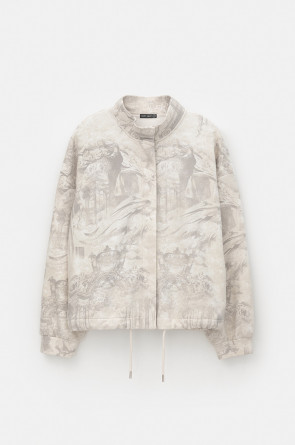 Укороченная трикотажная куртка на молнии с карманами и кулиской по низу. Произведена из мягкого набивного трикотажного футера. Спущенные рукава и манжеты добавляют объем.