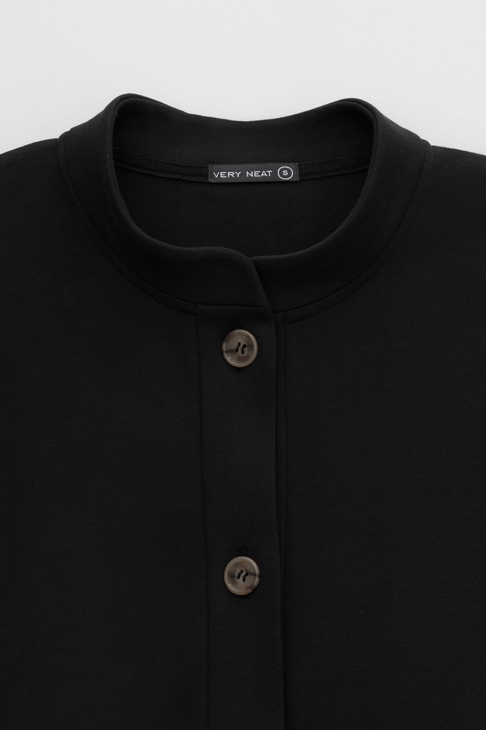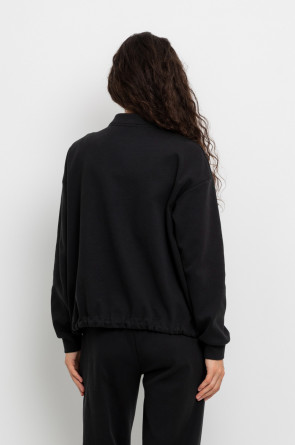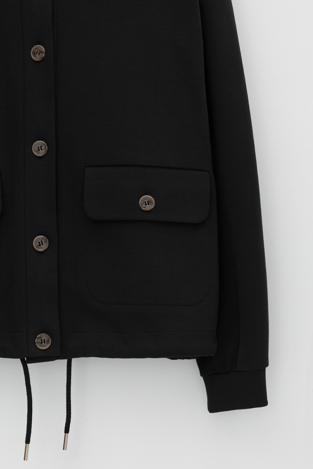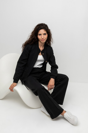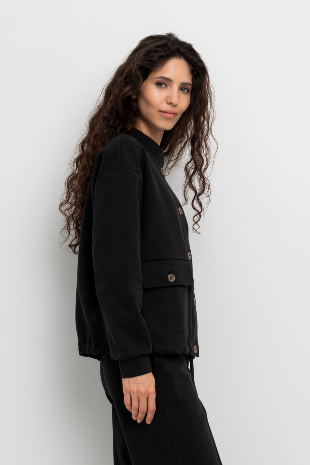 Укороченная куртка на пуговицах с карманами и кулиской по низу из плотного гладкого трикотажа интерлок. Спущенные рукава и манжеты добавляют объем.