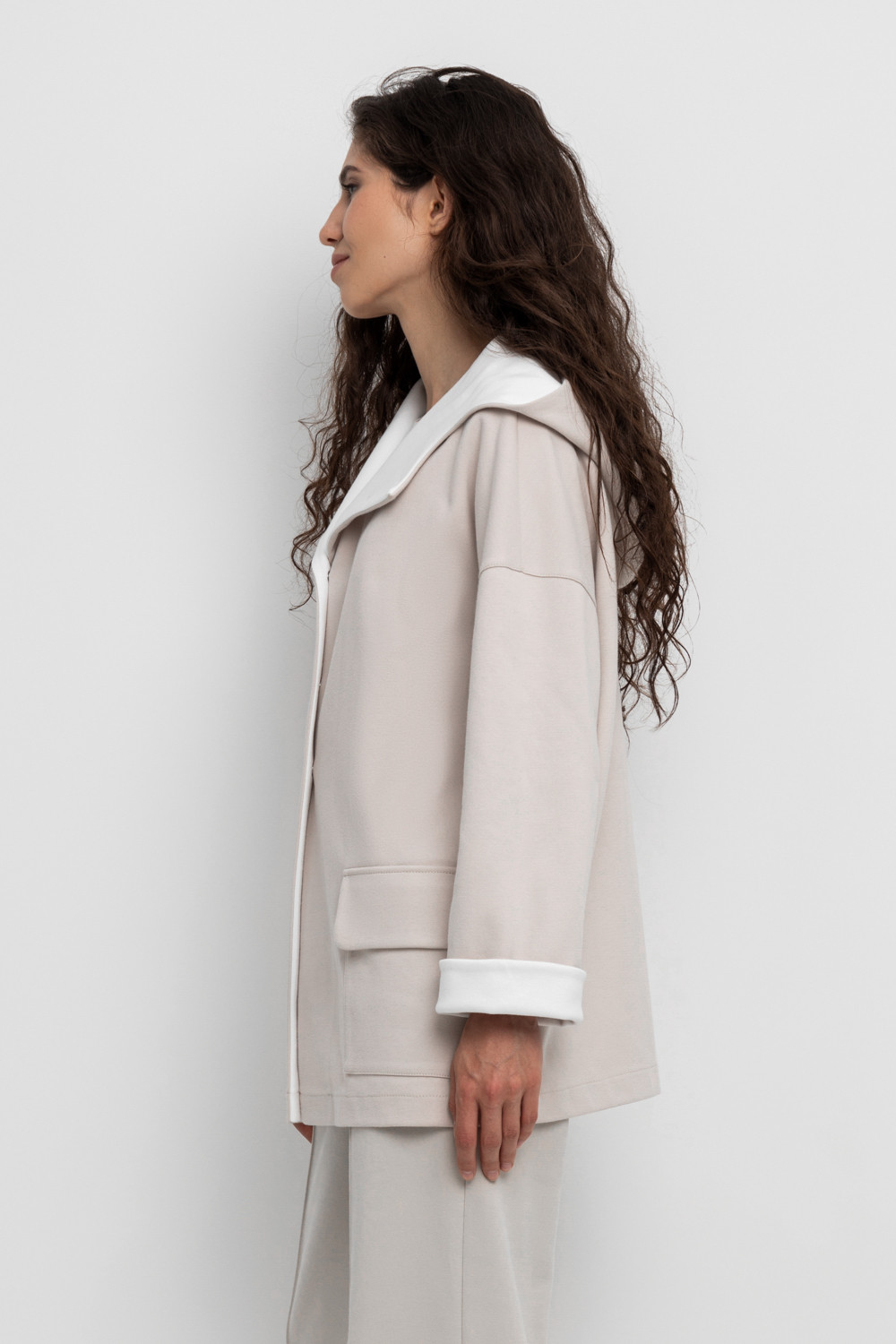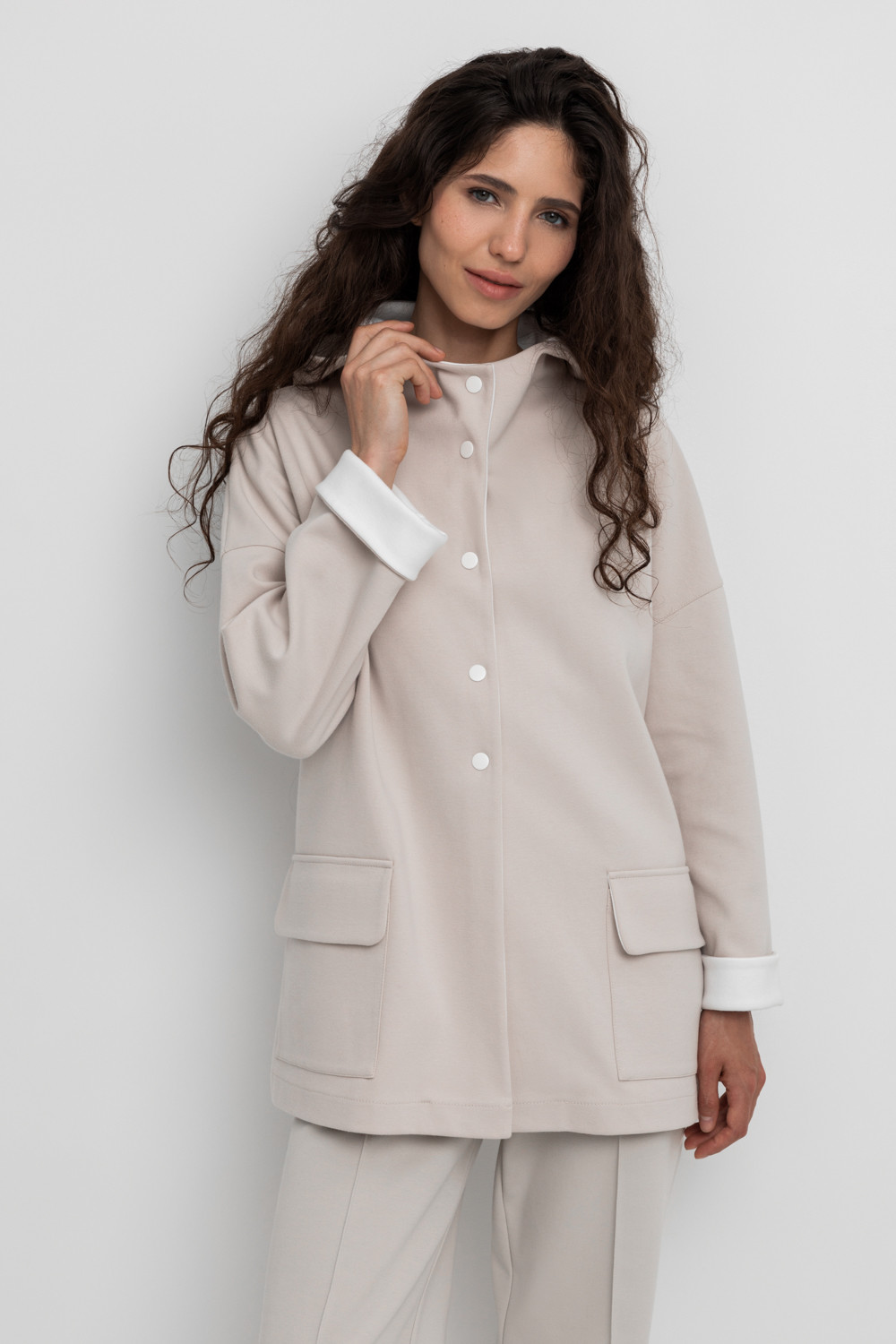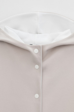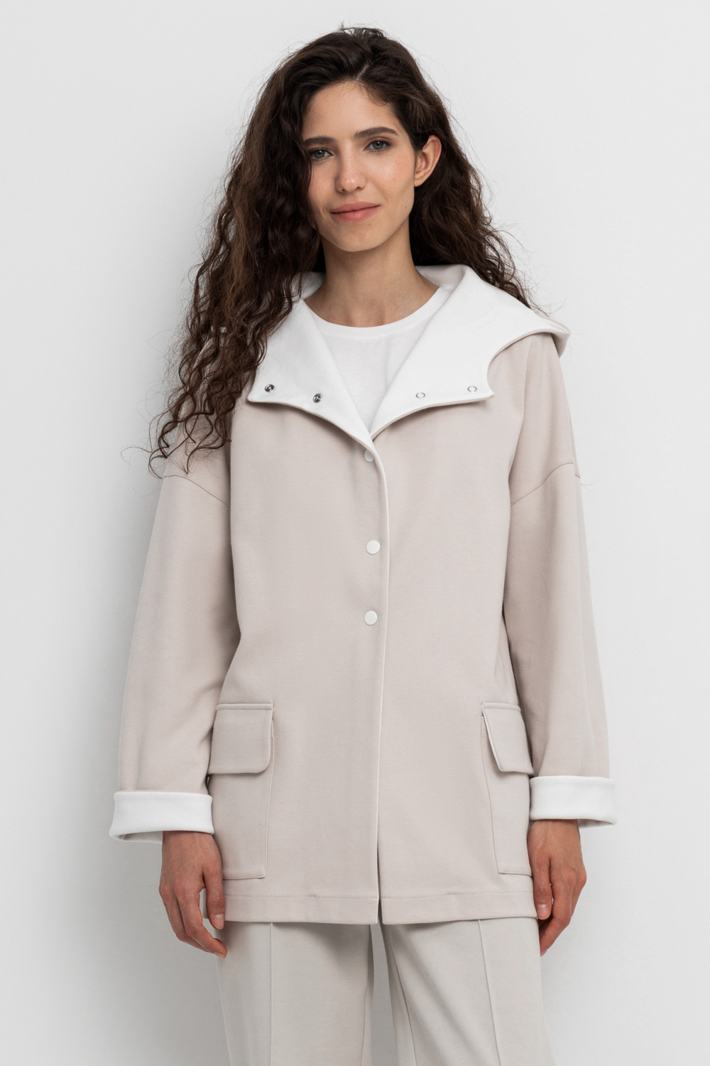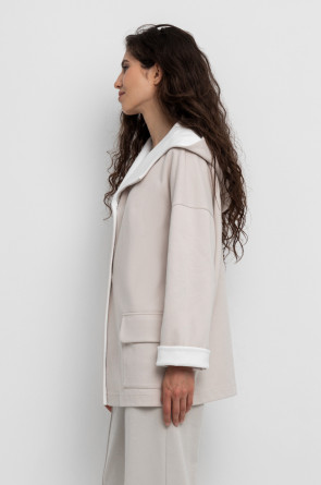 Женская куртка с капюшоном из плотного гладкого трикотажа интерлок со спандексом. Свободная модель с накладными карманами. Гладкий и плотный материал на основе хлопка сохраняет форму.
