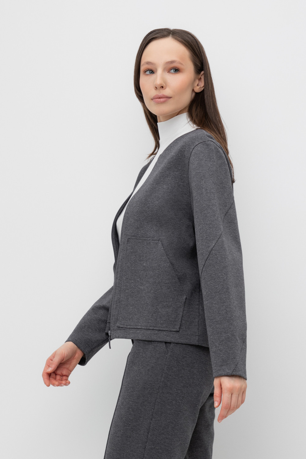 Объемный жакет на молнии с накладными карманами, выполненный из плотного гладкого трикотажа интерлок. В составе 80% натурального хлопка и 20% полиэстера, при этом полиэстер ввязан внутрь по особой технологии и не соприкасается с кожей.
