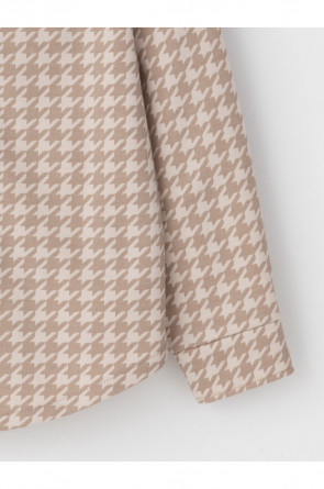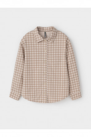 Свободная трикотажная рубашка для девочки из набивного петельчатого футера на кнопках. Модель с закругленным низом и спущенным плечом. Оригинальная набивка выполнена из стойких текстильных гипоаллергенных красителей.