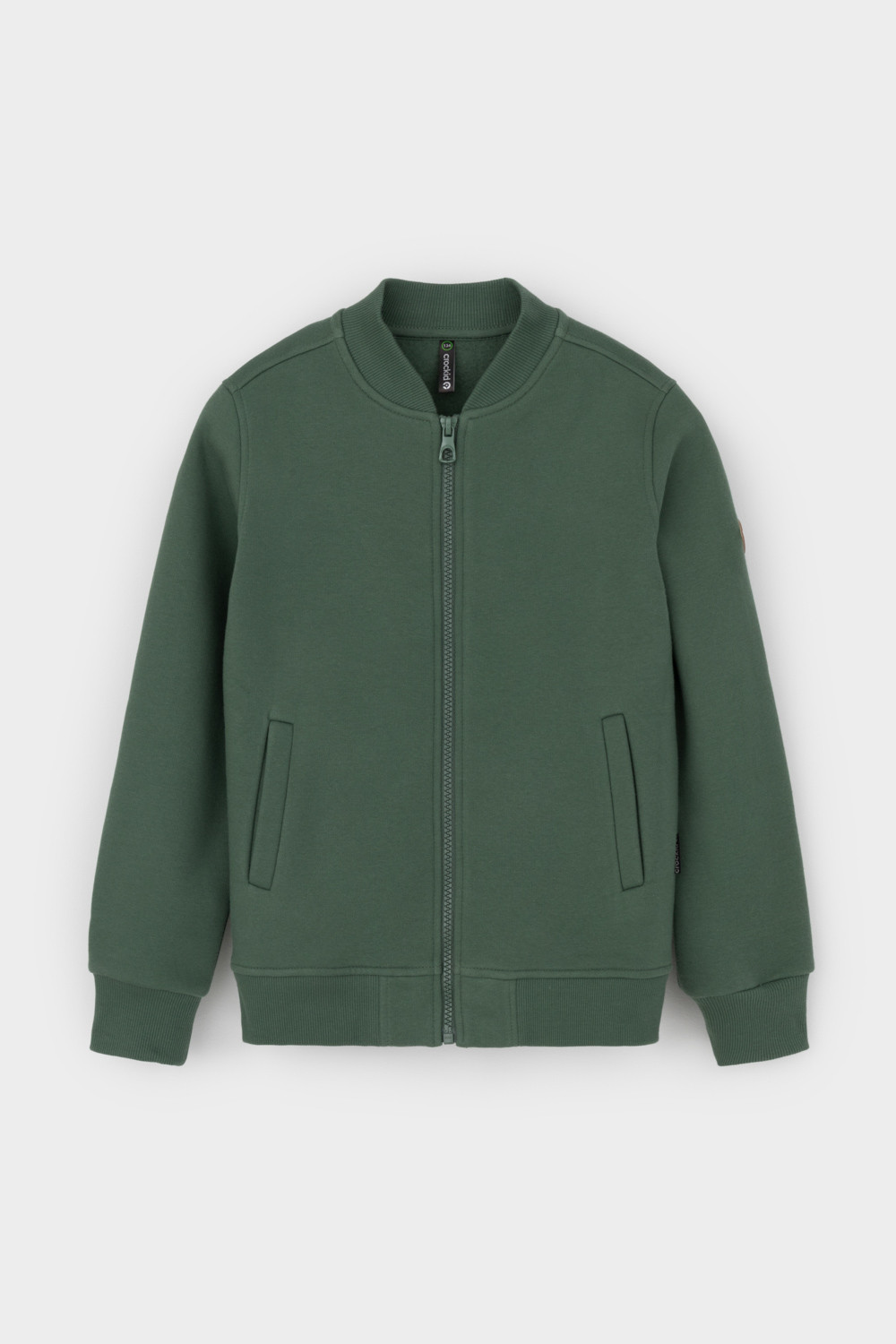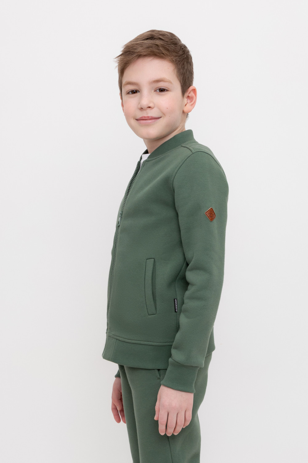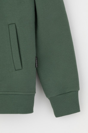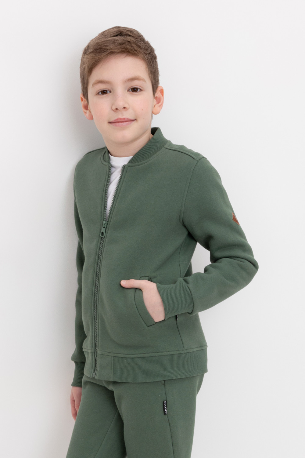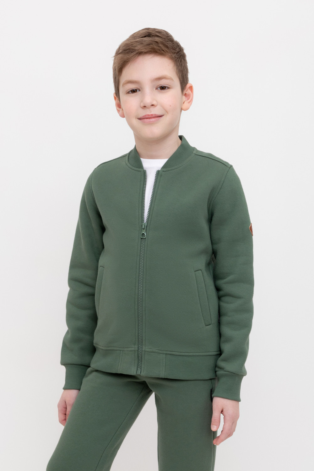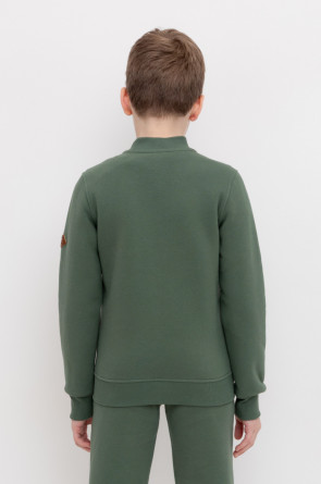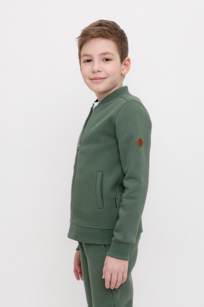 Трикотажный бомбер для мальчика из футера с начесом. Манжеты и пояс из эластичного трикотажа в рубчик.