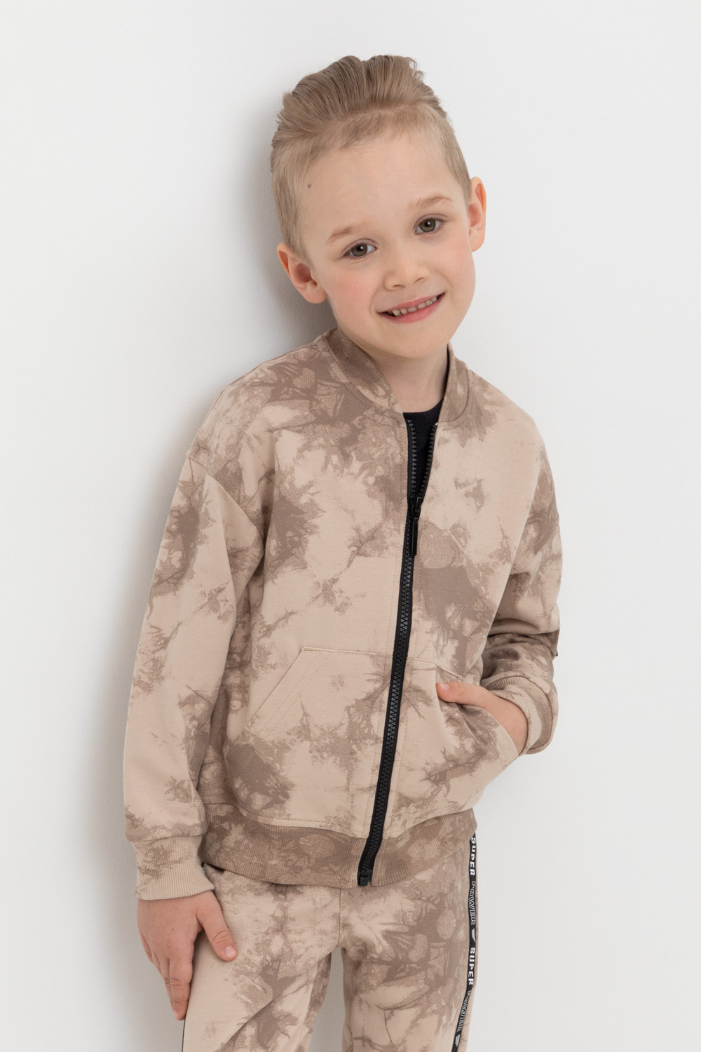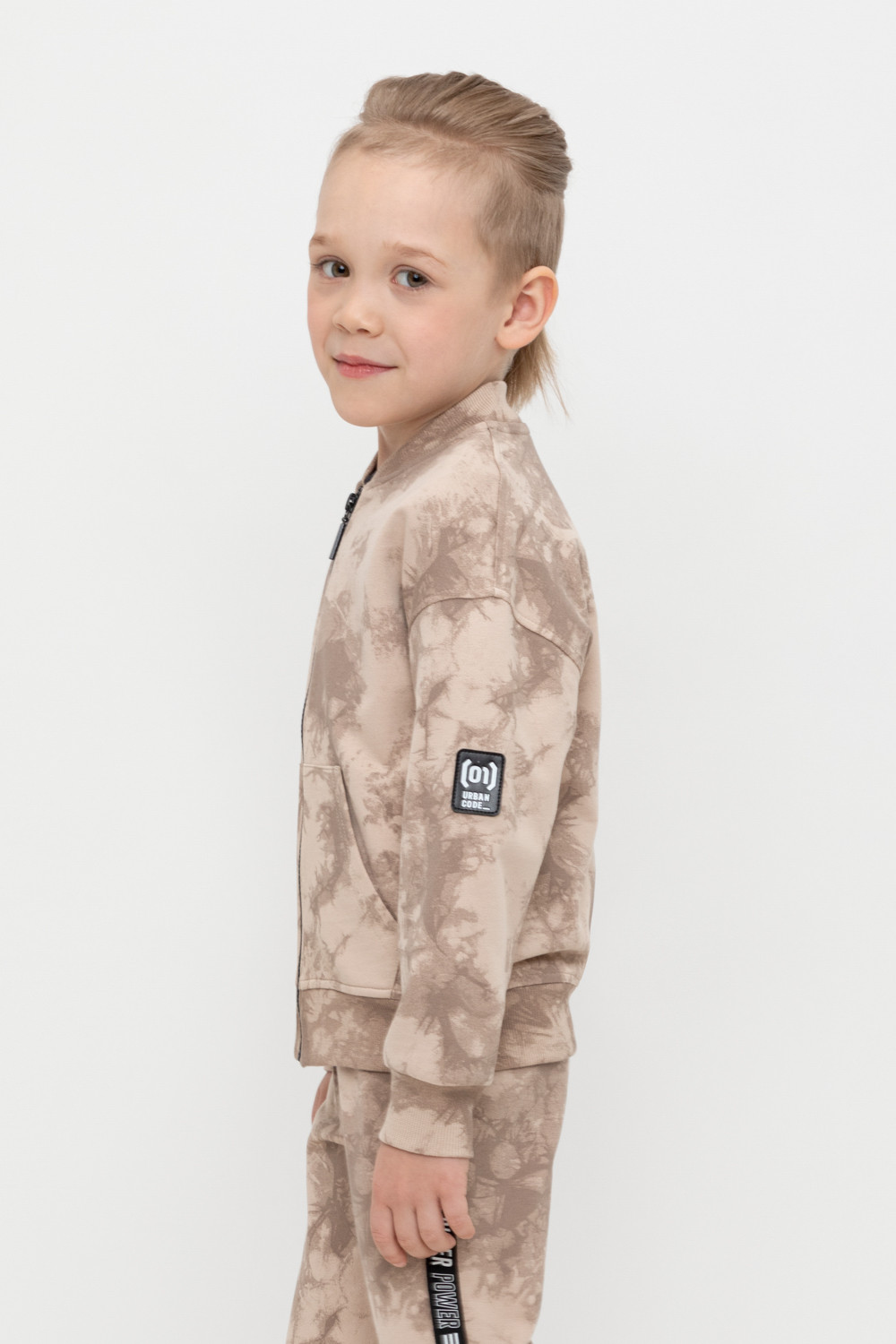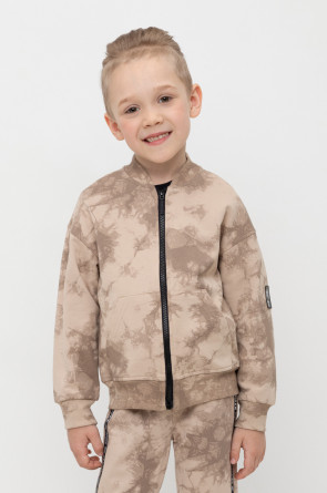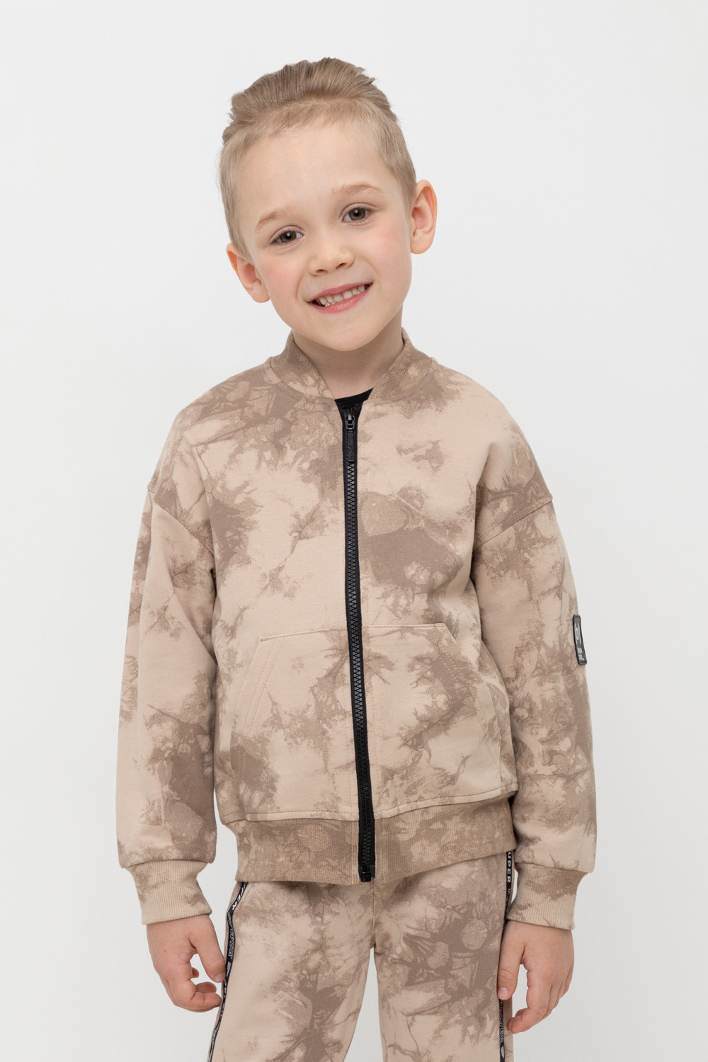 Трикотажный бомбер для мальчика из набивного петельчатого футера. Модель с эластичным воротником, манжетами и поясом. Удобные карманы.