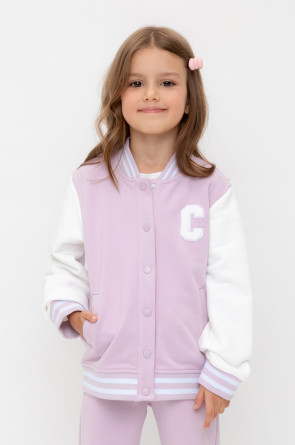Бомбер для девочки с контрастными рукавами из мягкого трикотажа. Воротник, манжеты и пояс - вязаные. Спереди карманы с листочкой.