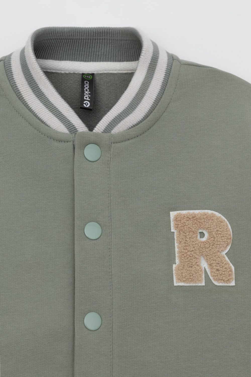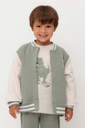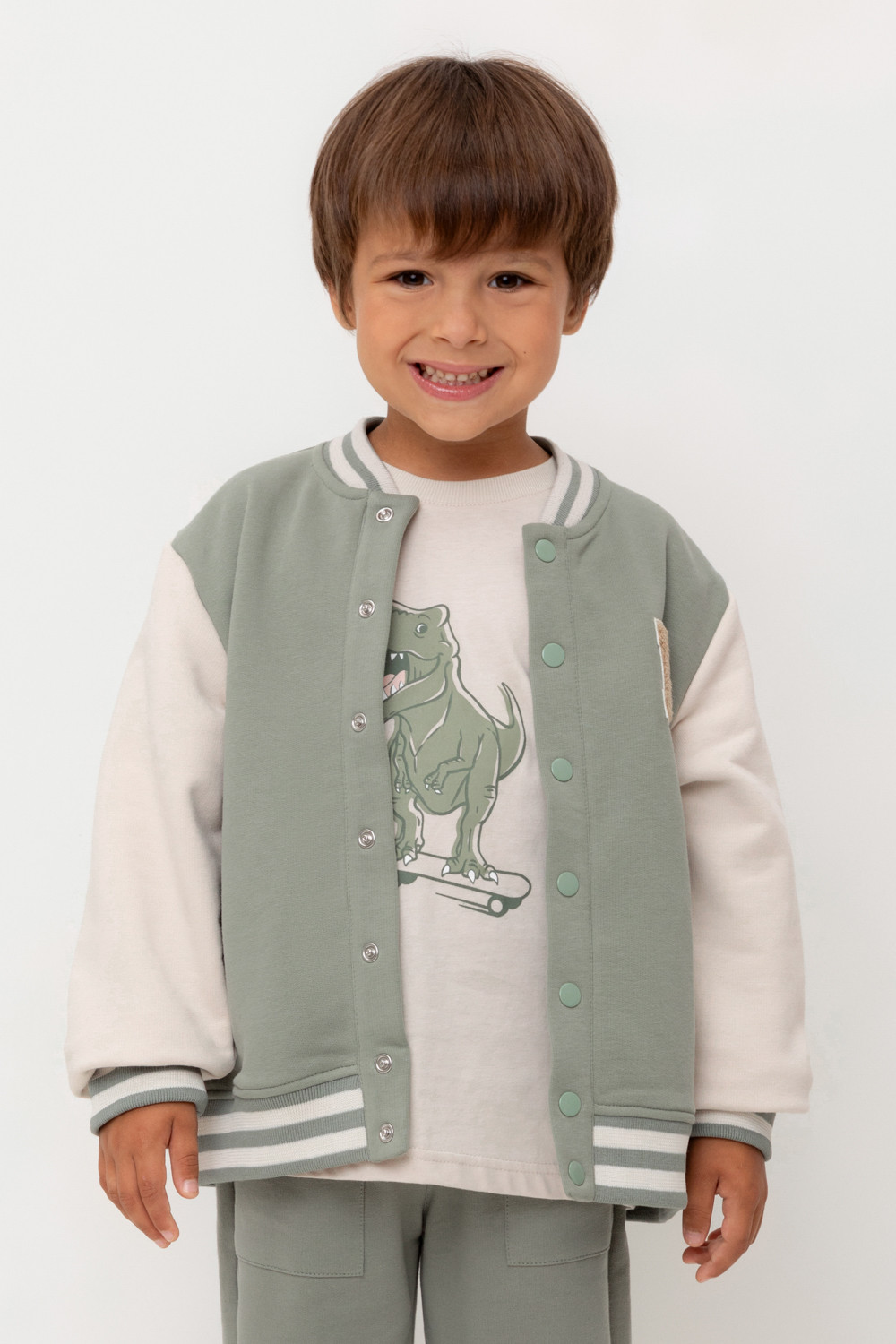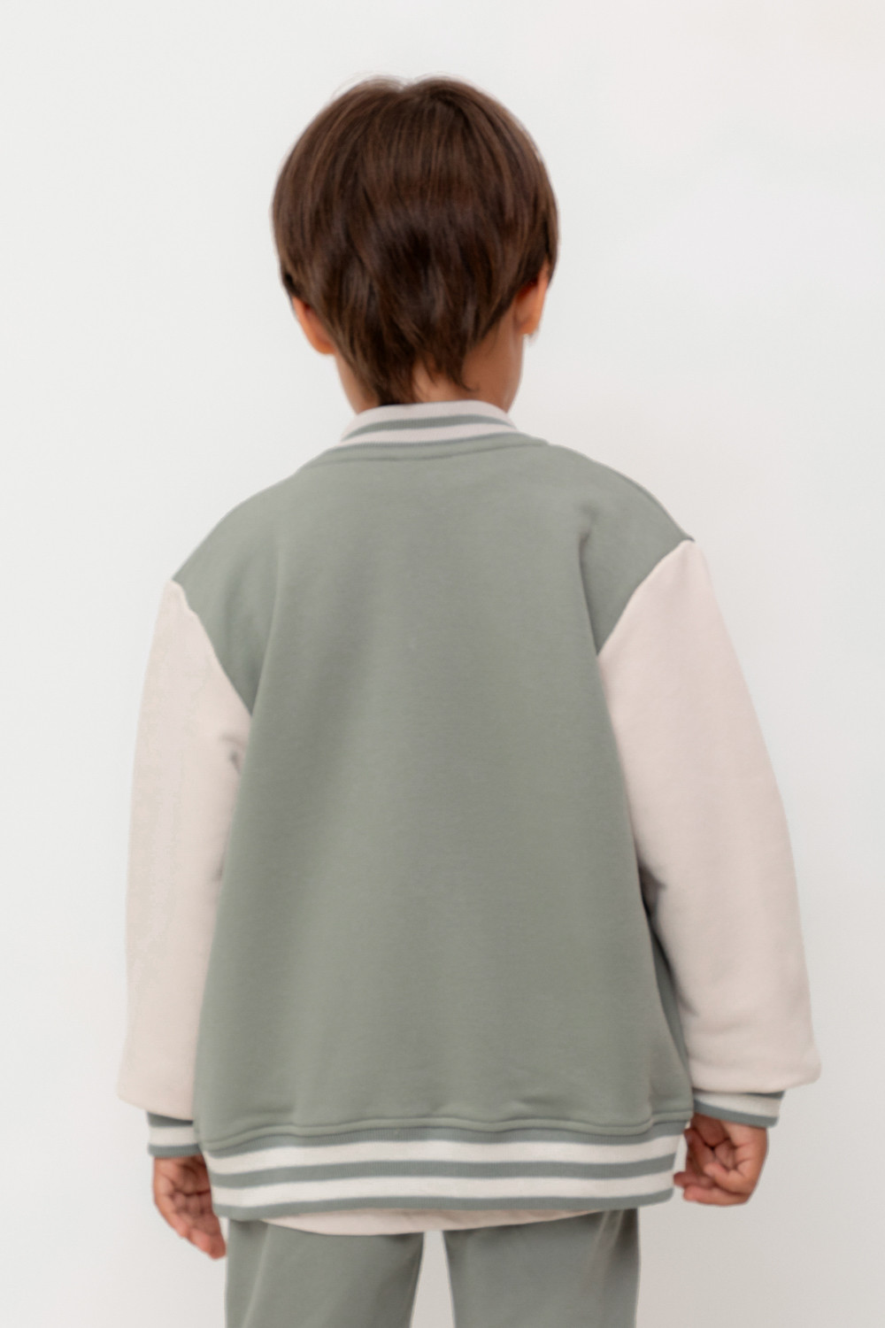 Бомбер с контрастными рукавами для мальчика. Изготовлен из мягкого петельчатого трикотажа. Застёгивается на кнопки. Воротник, манжеты и пояс - вязаные. Спереди карманы с листочкой.