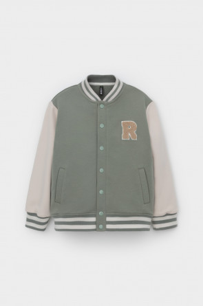 Бомбер с контрастными рукавами для мальчика. Изготовлен из мягкого петельчатого трикотажа. Застёгивается на кнопки. Воротник, манжеты и пояс - вязаные. Спереди карманы с листочкой.