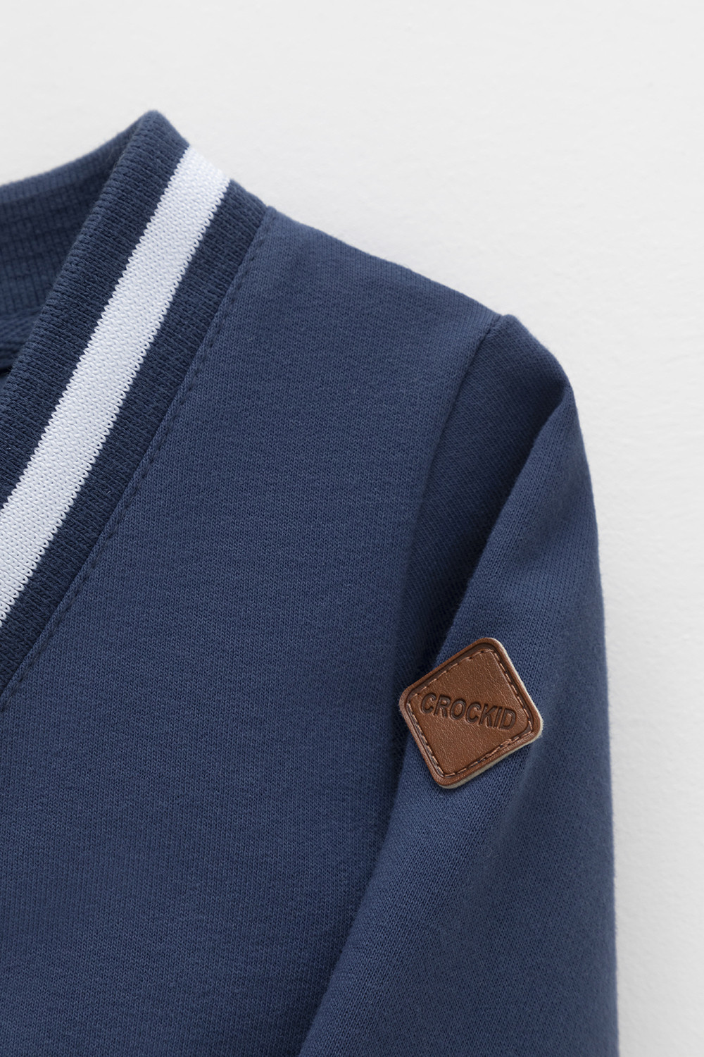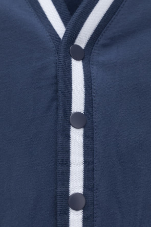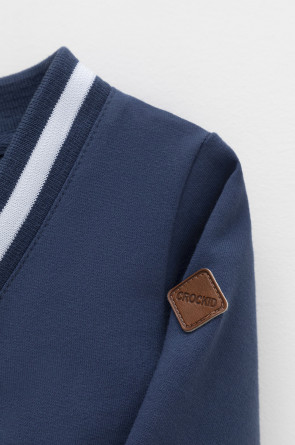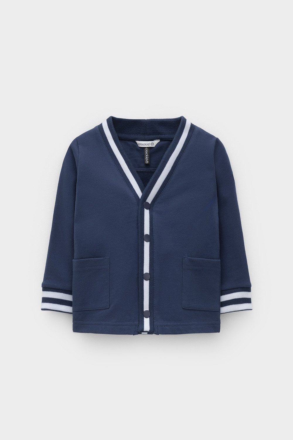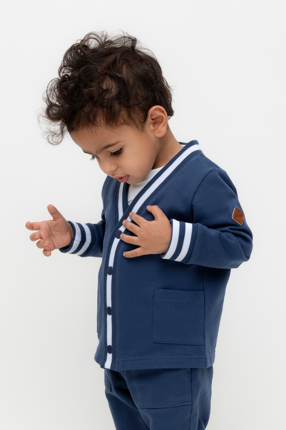 Жакет для мальчика из высококачественного трикотажного полотна футер петля. Застёгивается на кнопки. На рукавах эластичные вязаные манжеты. По бокам накладные карманы.