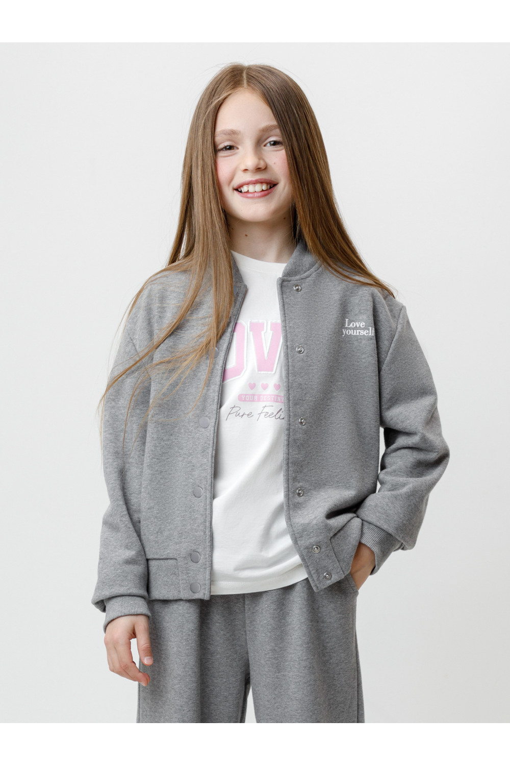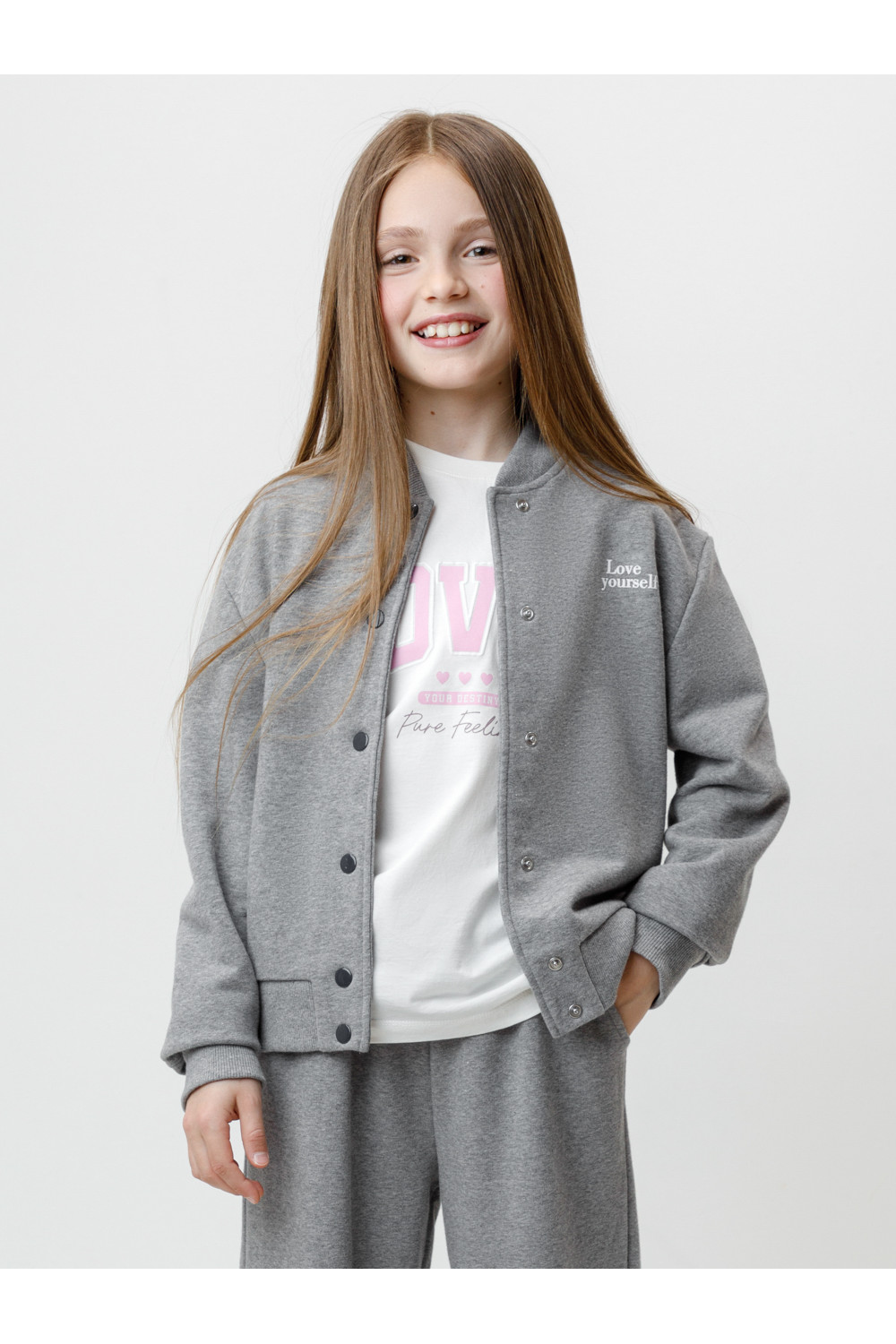 Бомбер для девочки из мягкого трикотажа. В составе 80% натурального хлопка и 20% полиэстера, при этом полиэстер ввязан внутрь по особой технологии и не соприкасается с кожей. Застёгивается на кнопки Воротник, манжеты и пояс выполнены из эластичного полотна. Изделие сохраняет цвет и форму после многократных стирок. Все трикотажные полотна производятся в соответствии с нормами швейцарского сертификата ЭкоТекс.