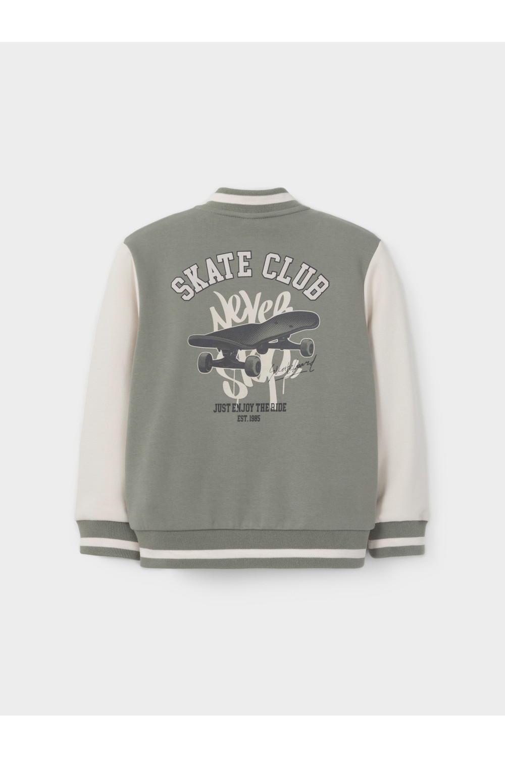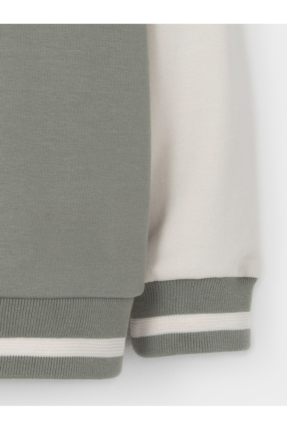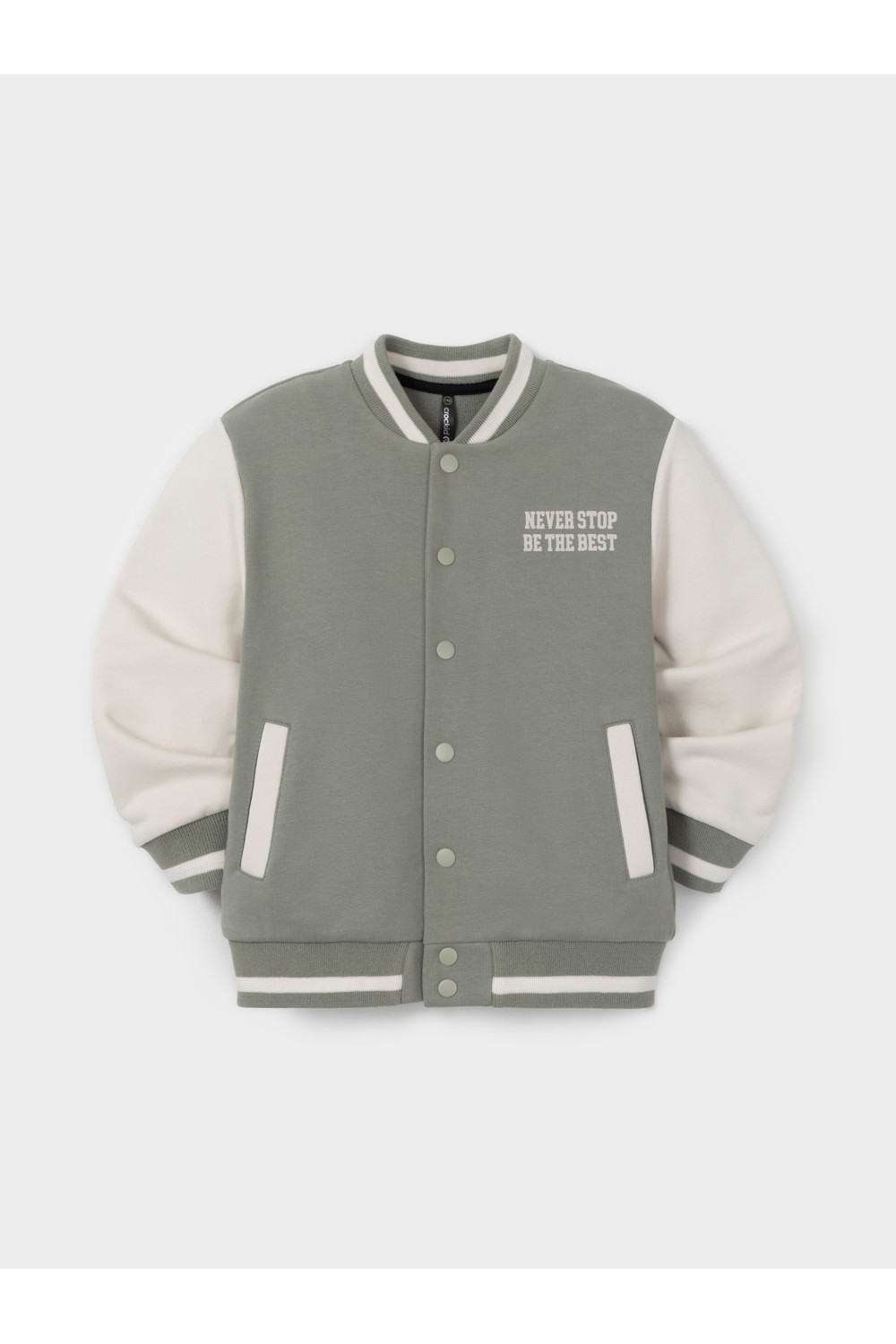 Бомбер для мальчика с контрастными рукавами из мягкого трикотажа. В составе 80% натурального хлопка и 20% полиэстера, при этом полиэстер ввязан внутрь по особой технологии и не соприкасается с кожей. Застёгивается на кнопки. Воротник, манжеты и пояс вязаные. Спереди два кармана. Изделие сохраняет цвет и форму после многократных стирок. Все трикотажные полотна производятся в соответствии с нормами швейцарского сертификата ЭкоТекс.