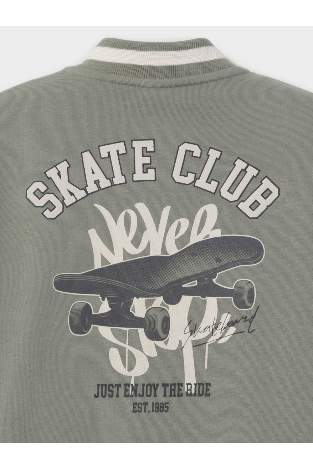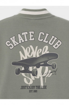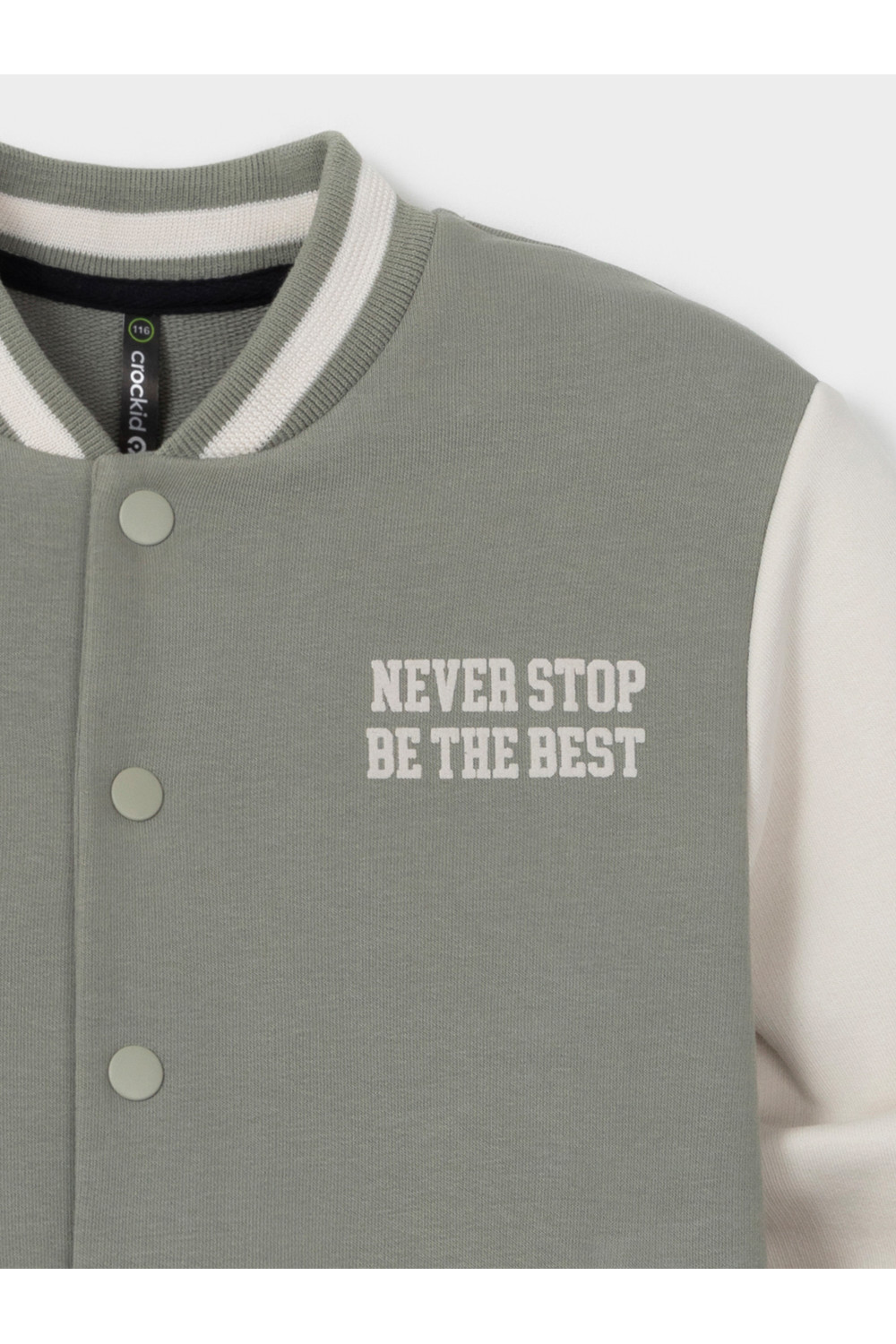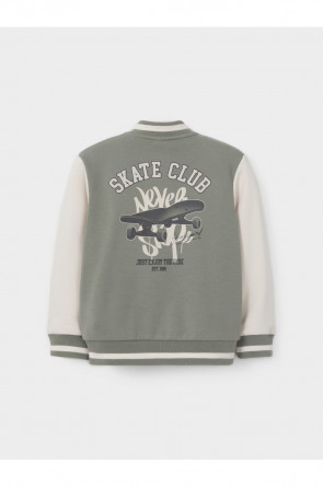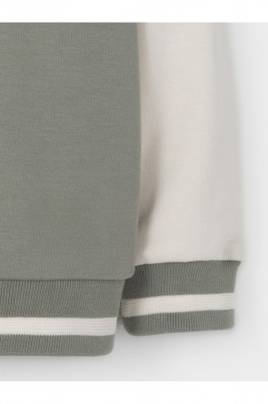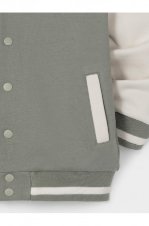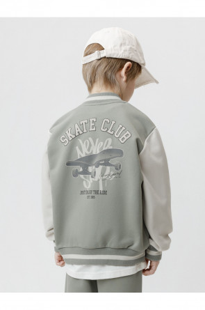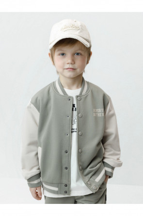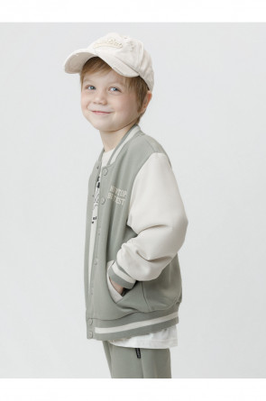 Бомбер для мальчика с контрастными рукавами из мягкого трикотажа. В составе 80% натурального хлопка и 20% полиэстера, при этом полиэстер ввязан внутрь по особой технологии и не соприкасается с кожей. Застёгивается на кнопки. Воротник, манжеты и пояс вязаные. Спереди два кармана. Изделие сохраняет цвет и форму после многократных стирок. Все трикотажные полотна производятся в соответствии с нормами швейцарского сертификата ЭкоТекс.