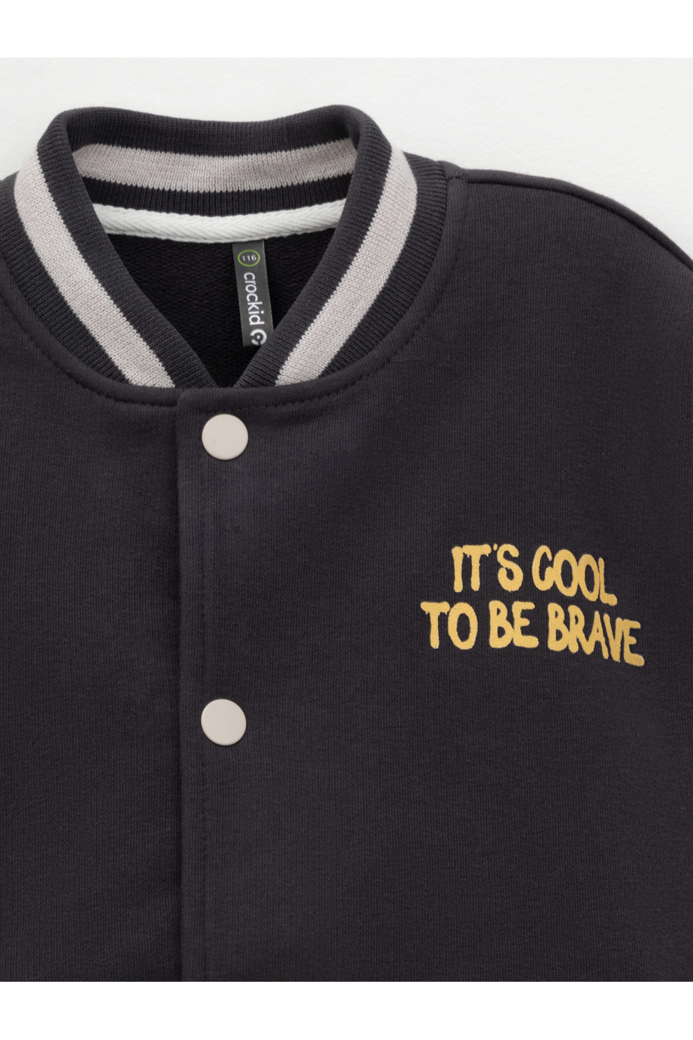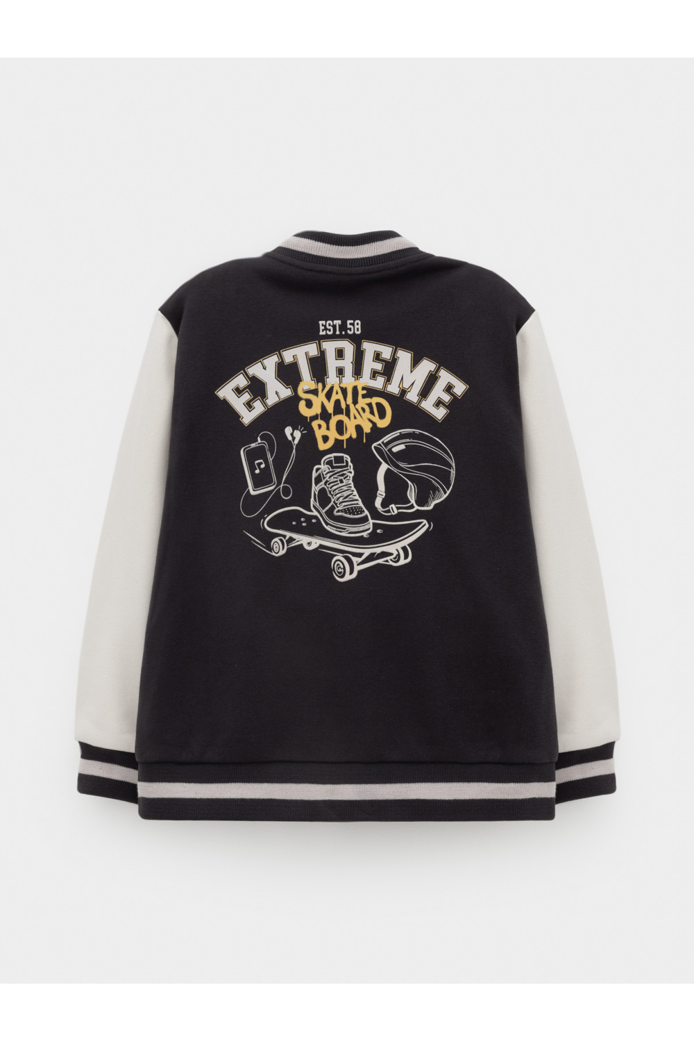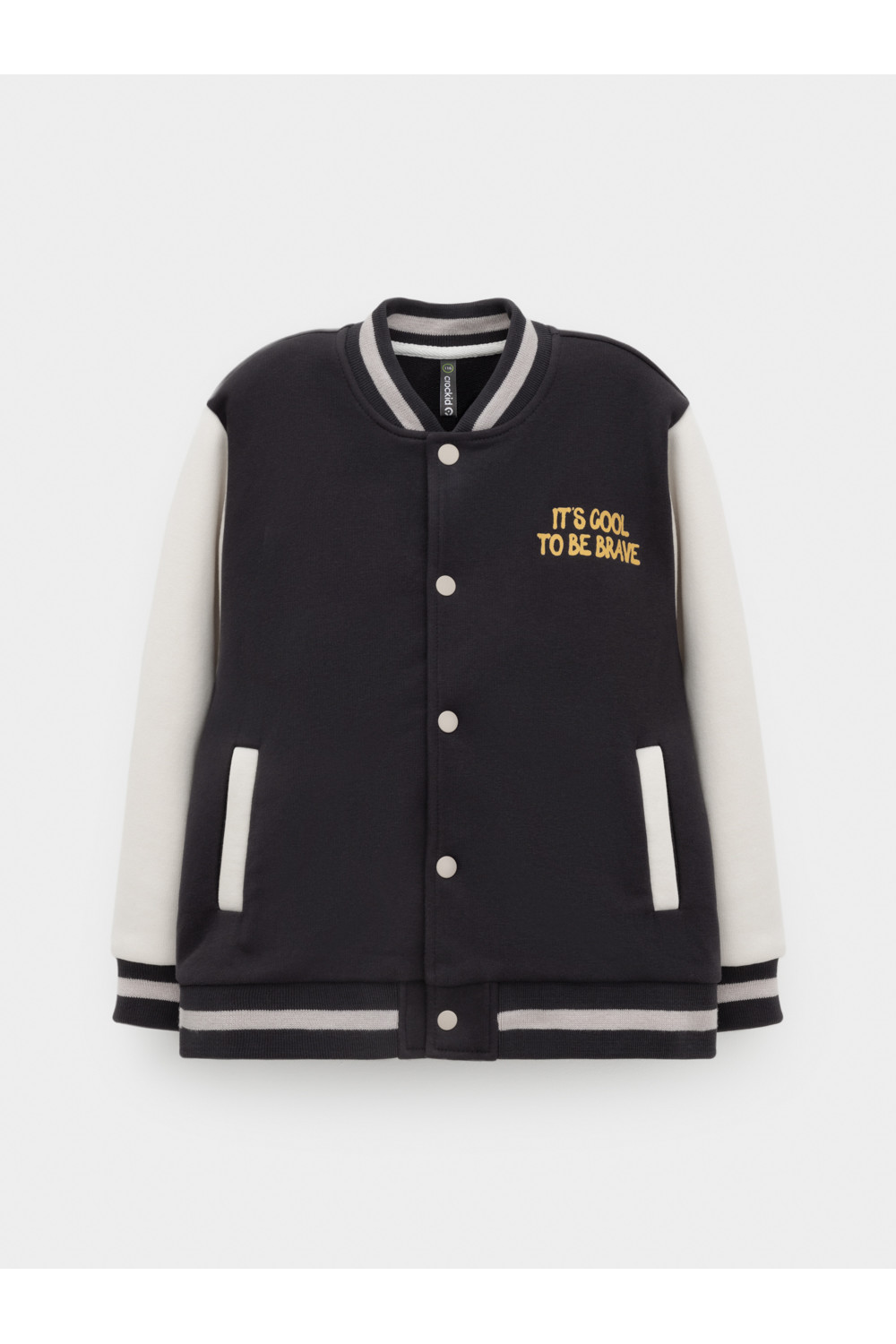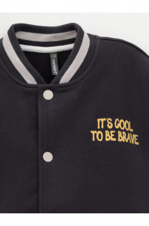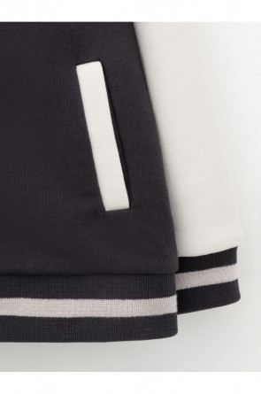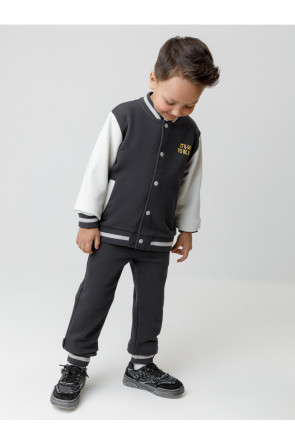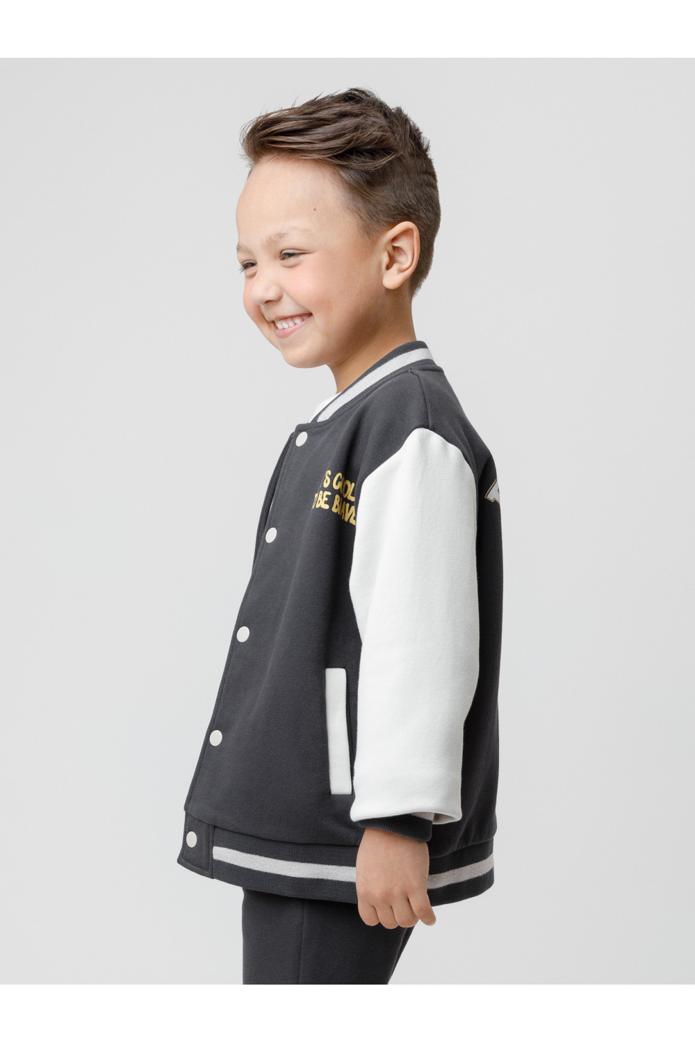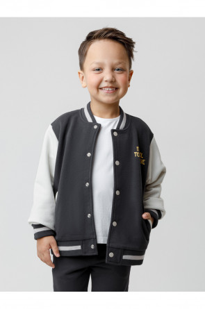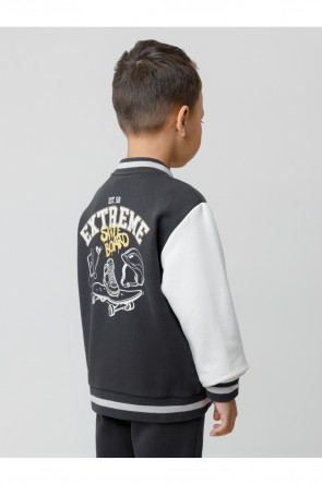Бомбер для мальчика с контрастными рукавами из мягкого трикотажа. Застёгивается на кнопки. Воротник, манжеты и пояс вязаные. Спереди два кармана. Изделие сохраняет цвет и форму после многократных стирок. Все трикотажные полотна производятся в соответствии с нормами швейцарского сертификата ЭкоТекс.