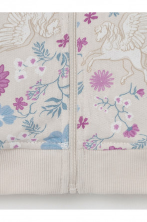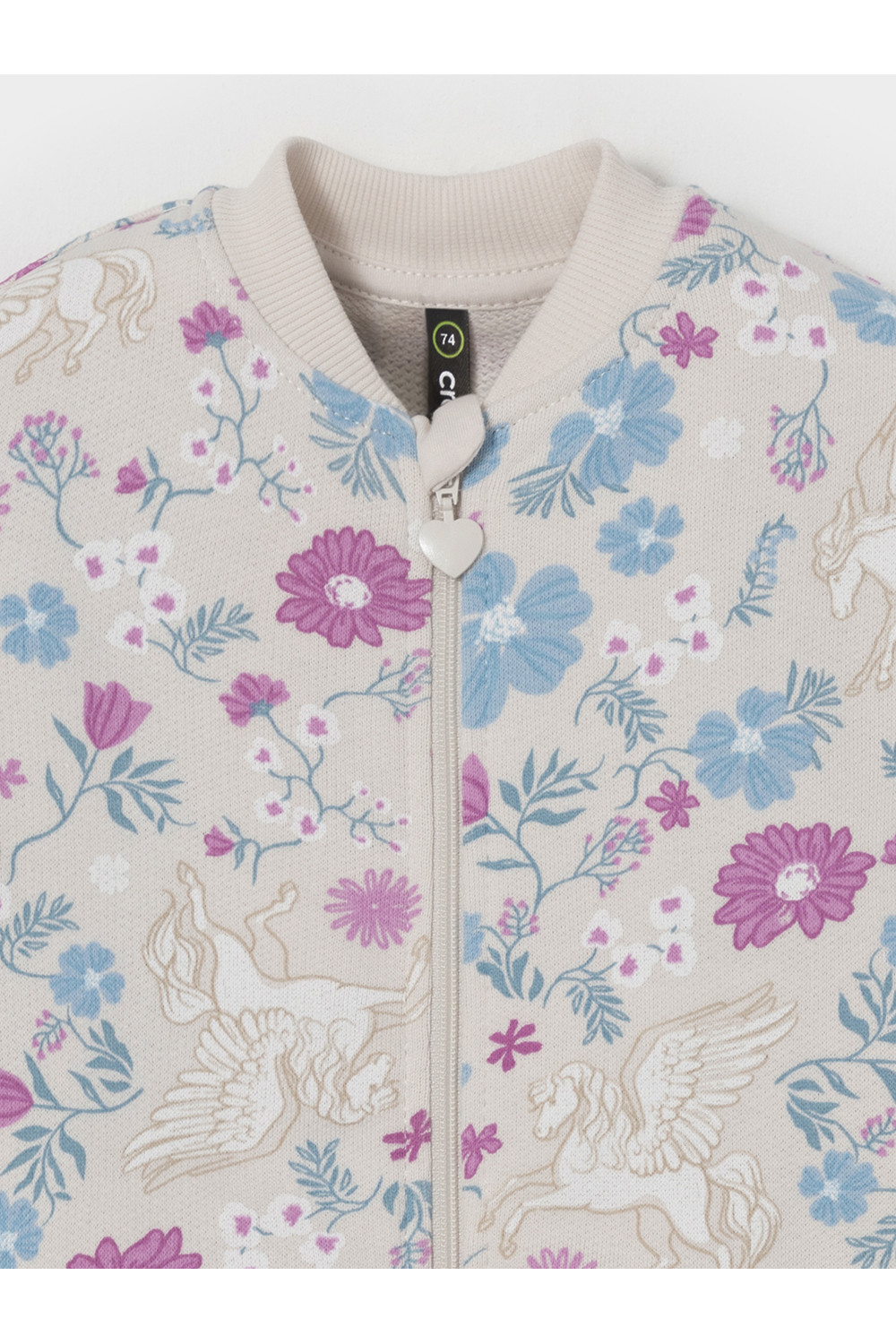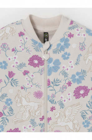 Трикотажная куртка-бомбер для девочки. Изготовлена из мягкого футера петли трёхнитки. Застёгивается на молнию с мягкой защитой шеи и подбородка. По бокам два кармана. Воротничок, манжеты и пояс выполнены из эластичного трикотажа в рубчик. Изделие сохраняет цвет и форму после многократных стирок. Все трикотажные полотна производятся в соответствии с нормами швейцарского сертификата ЭкоТекс.