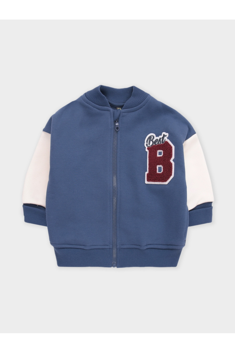 Трикотажная куртка-бомбер для мальчика с контрастными рукавами. Изготовлена из мягкого петельчатого трикотажа. В составе 80% натурального хлопка и 20% полиэстера, при этом полиэстер ввязан внутрь по особой технологии и не соприкасается с кожей. Застёгивается на молнию с мягкой защитой шеи и подбородка. По бокам два кармана. Воротничок, манжеты и пояс вязаные. Изделие сохраняет цвет и форму после многократных стирок. Все трикотажные полотна производятся в соответствии с нормами швейцарского сертификата ЭкоТекс.