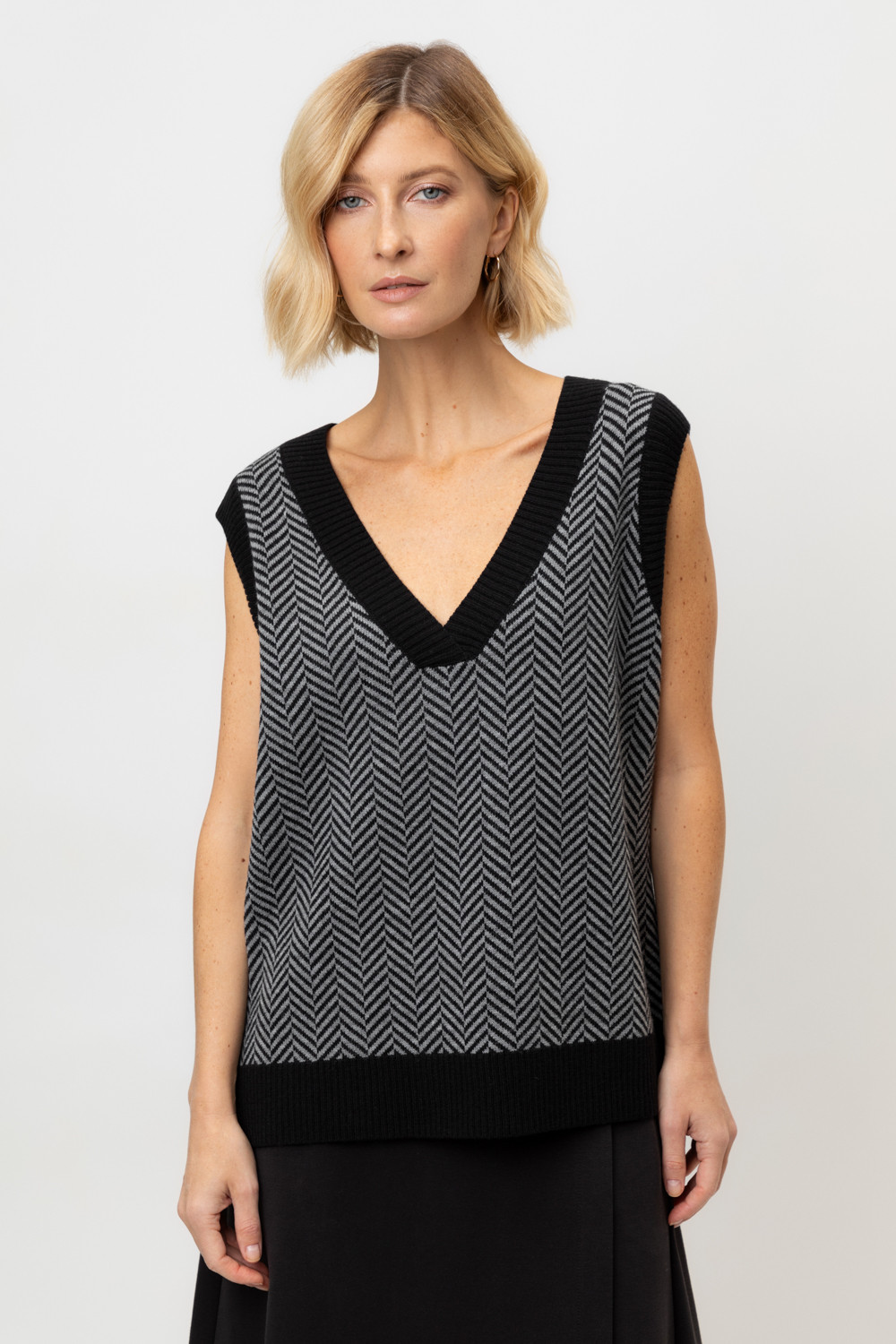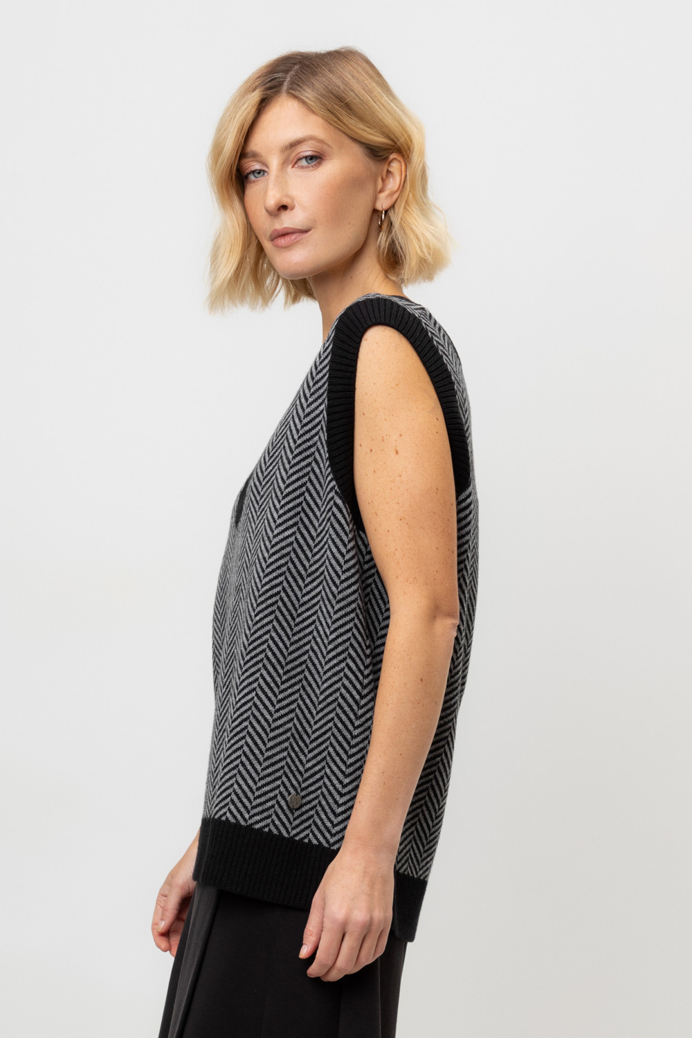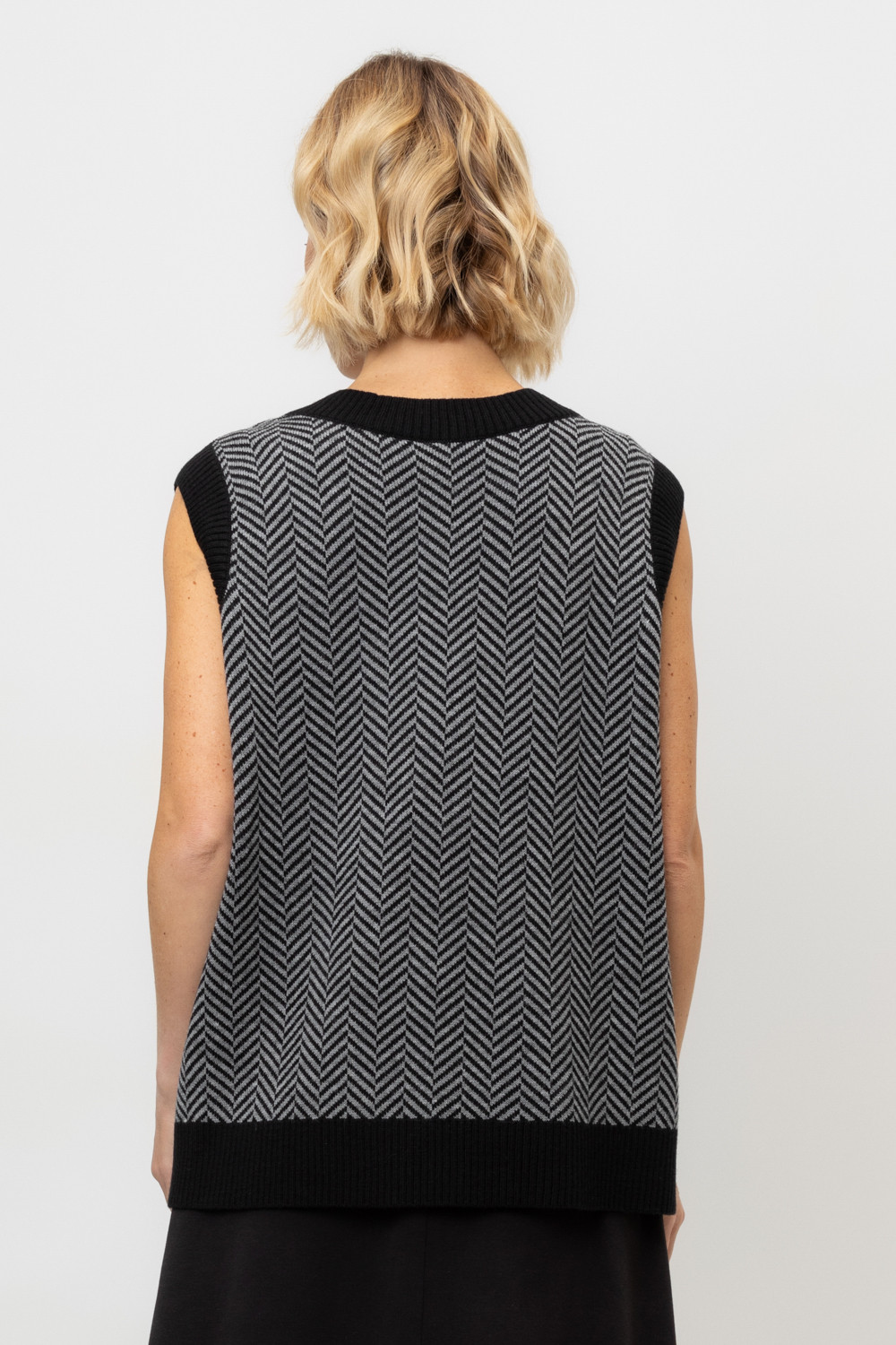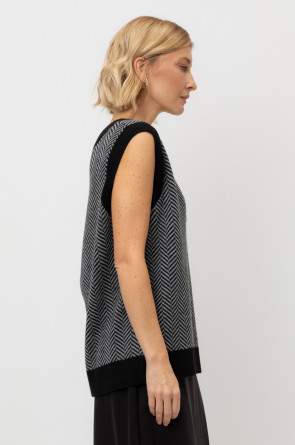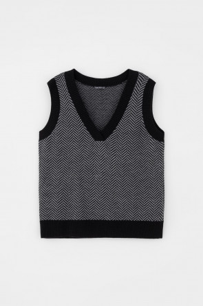 Вязаный жилет с элегантным глубоким вырезом. В составе 50% шерсти и 50% акрила. Шерсть в составе сохраняет тепло, а акрил делает изделие мягким и объемным.