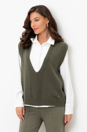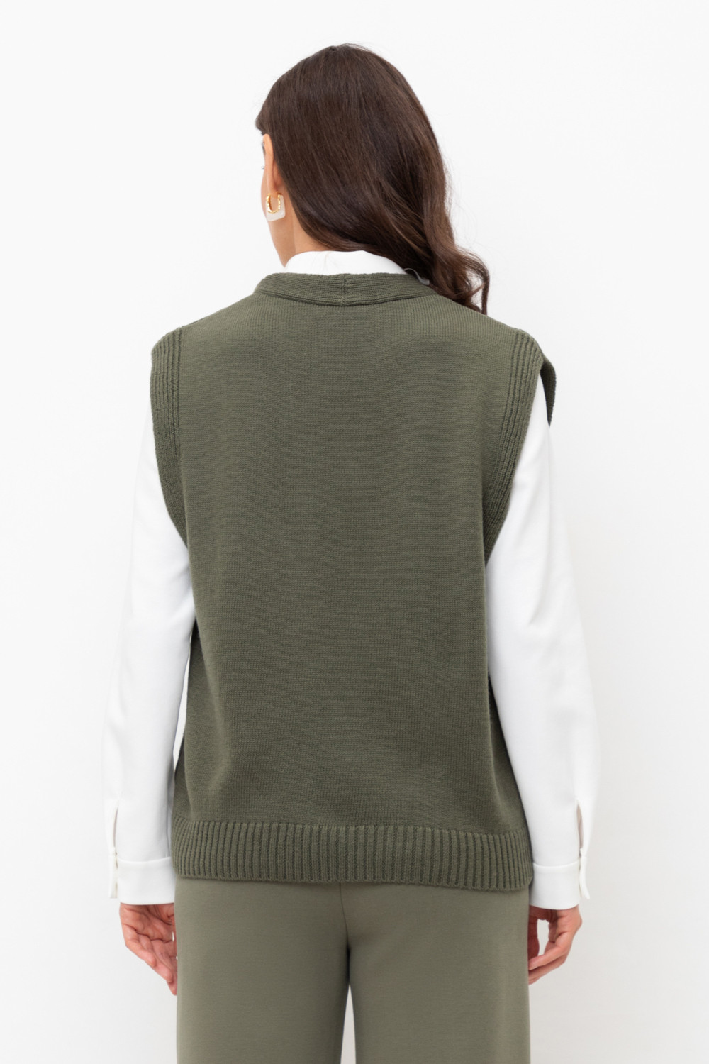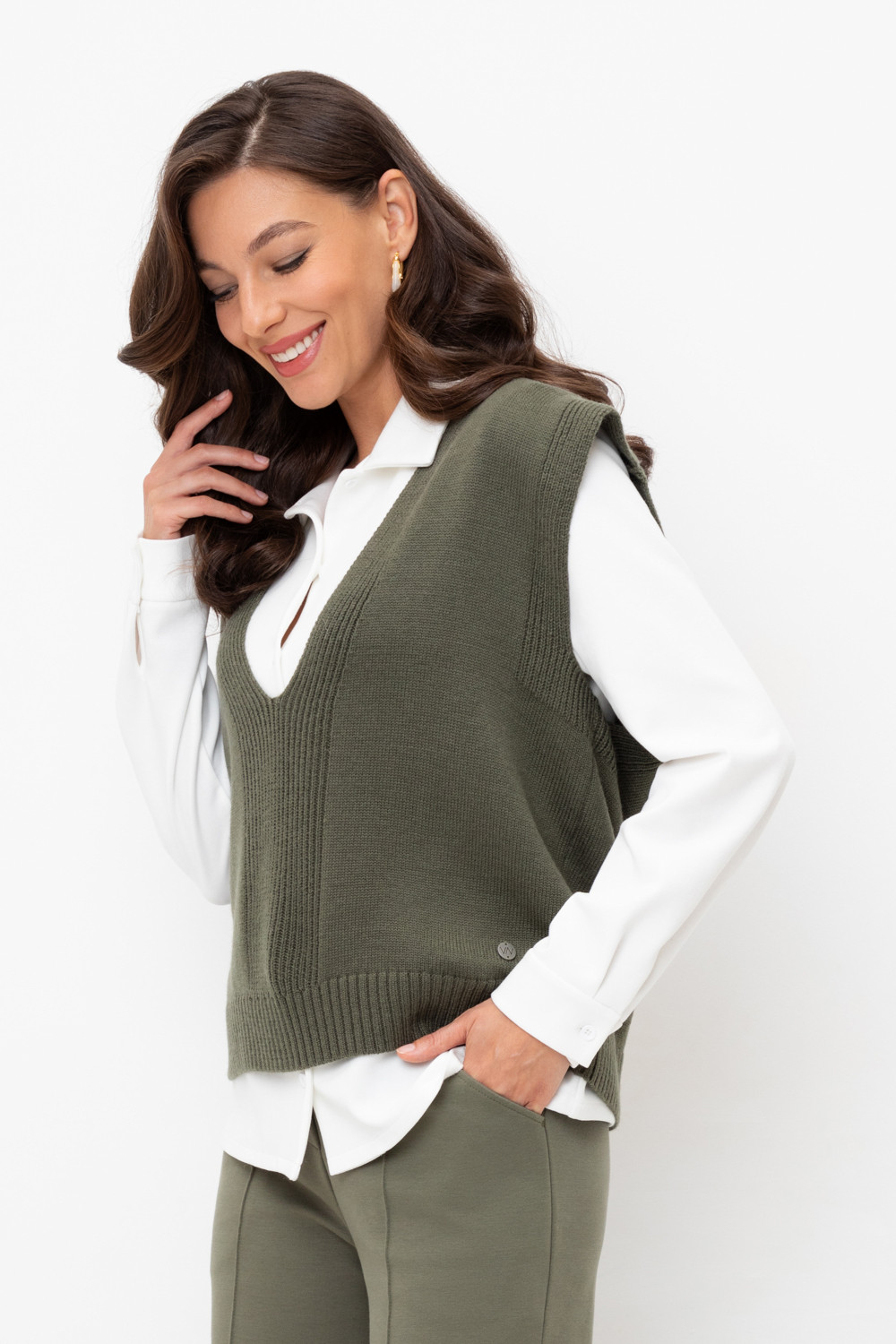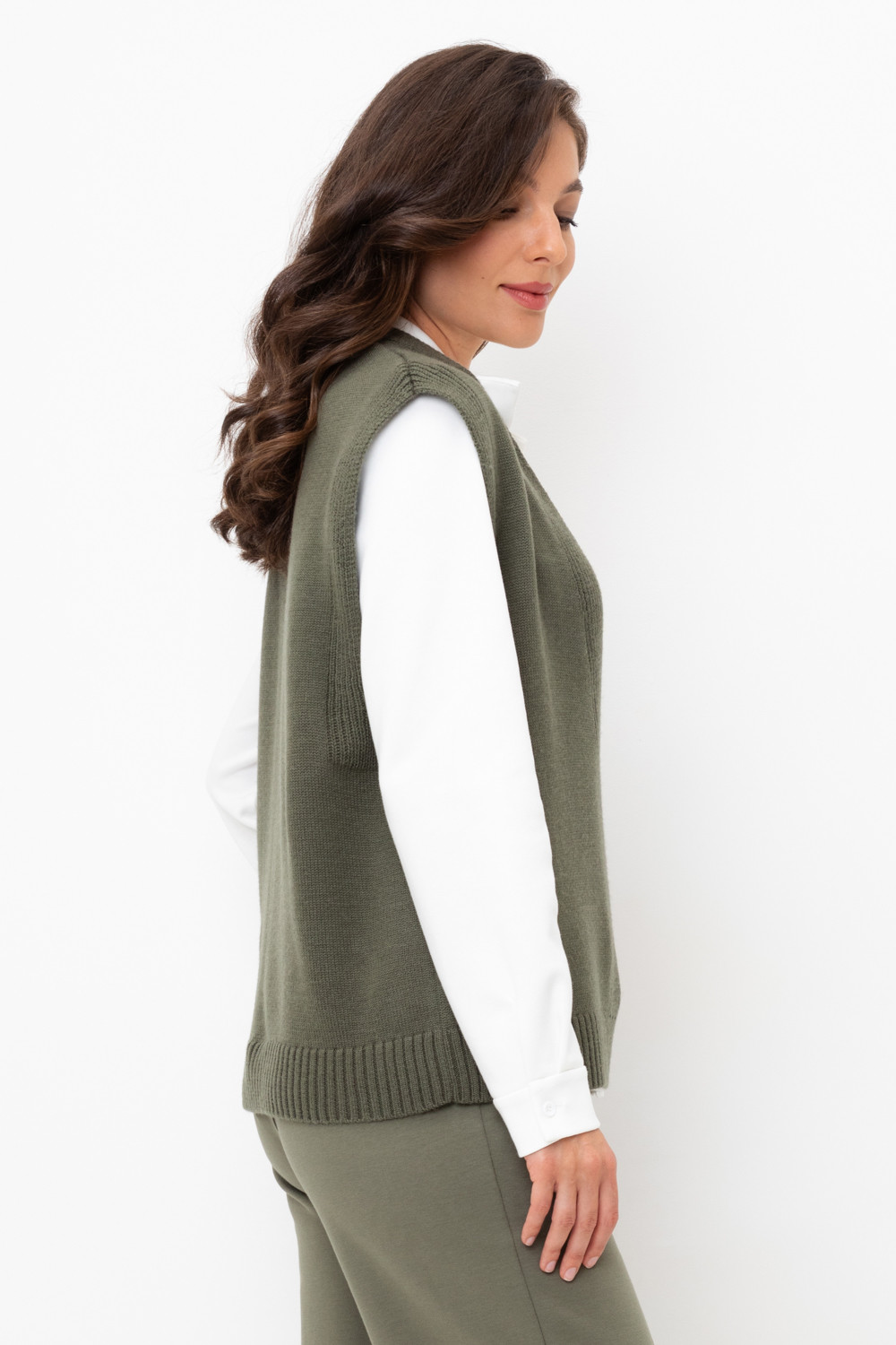 Вязаный жилет с элегантным глубоким вырезом. В составе 50% шерсти и 50% акрила. Шерсть в составе сохраняет тепло, а акрил делает изделие мягким и объемным.