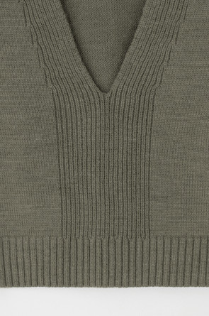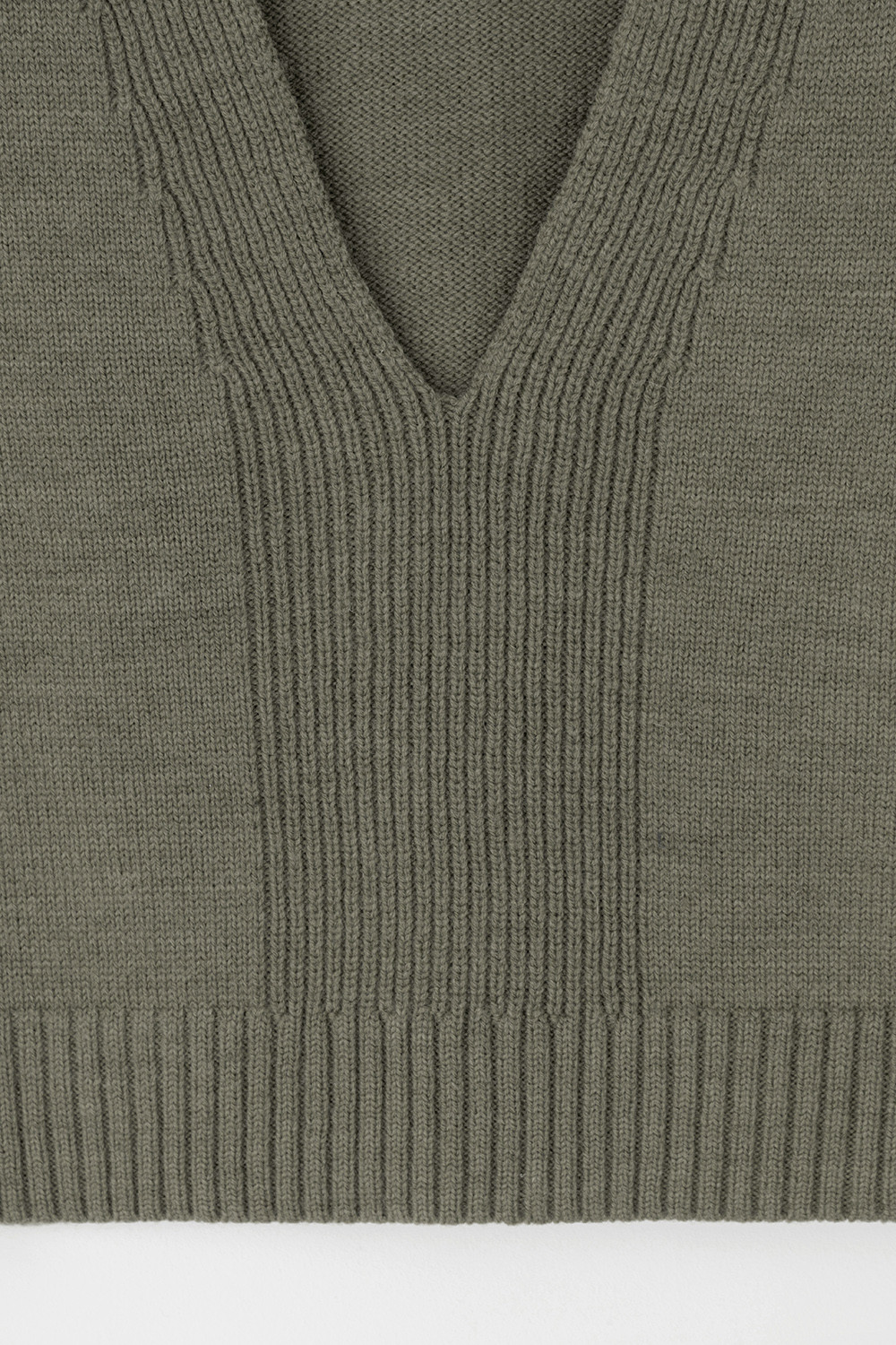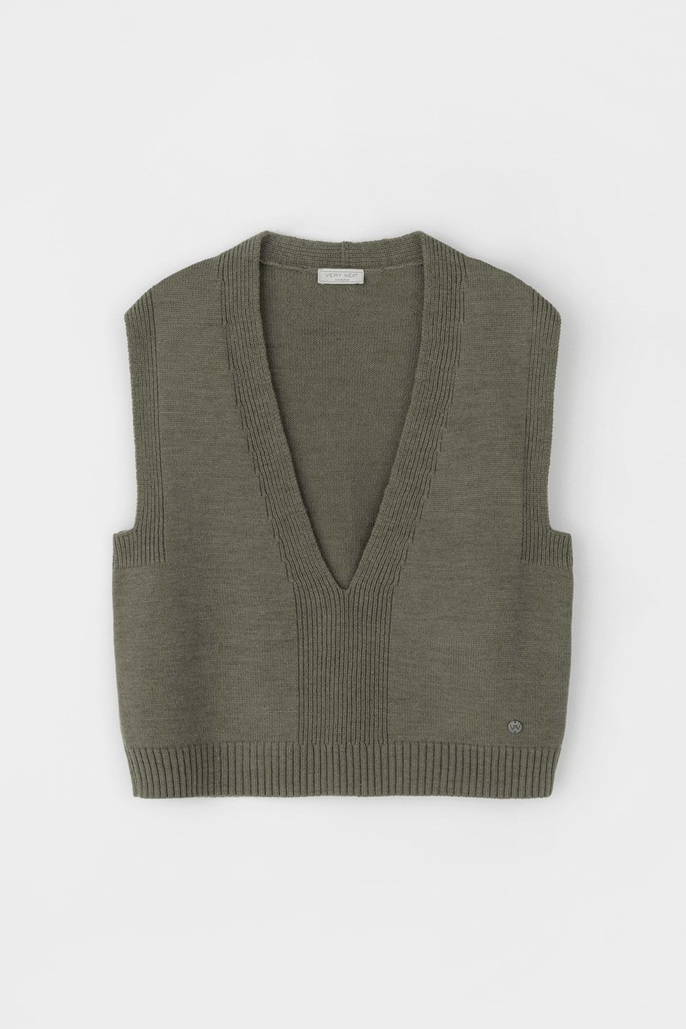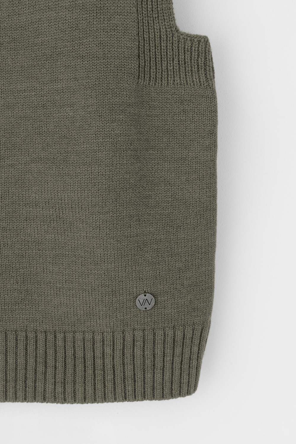 Вязаный жилет с элегантным глубоким вырезом. В составе 50% шерсти и 50% акрила. Шерсть в составе сохраняет тепло, а акрил делает изделие мягким и объемным.