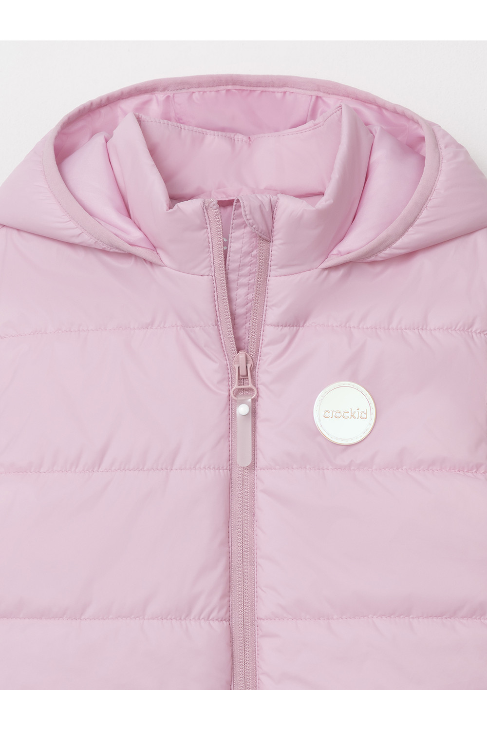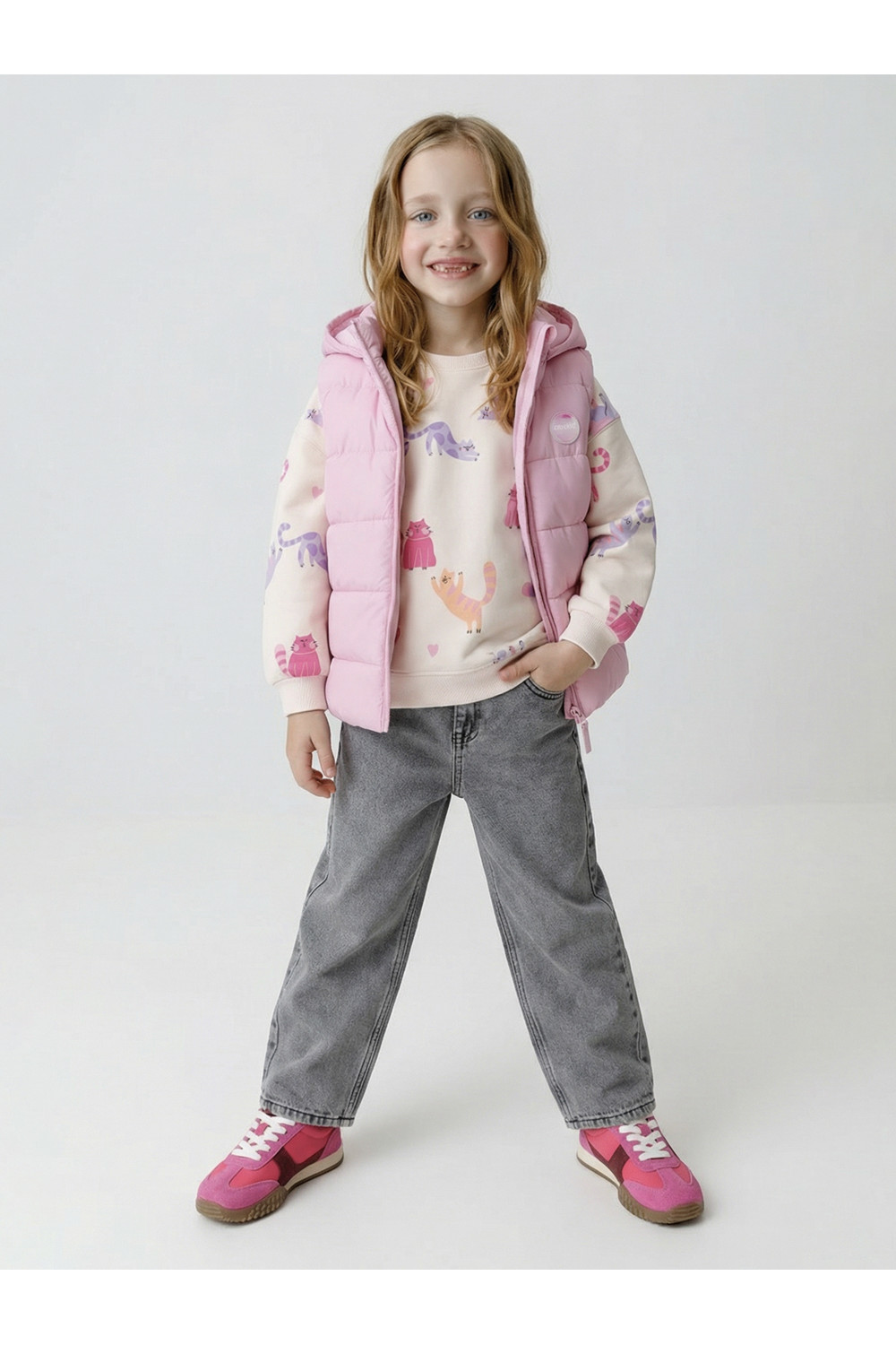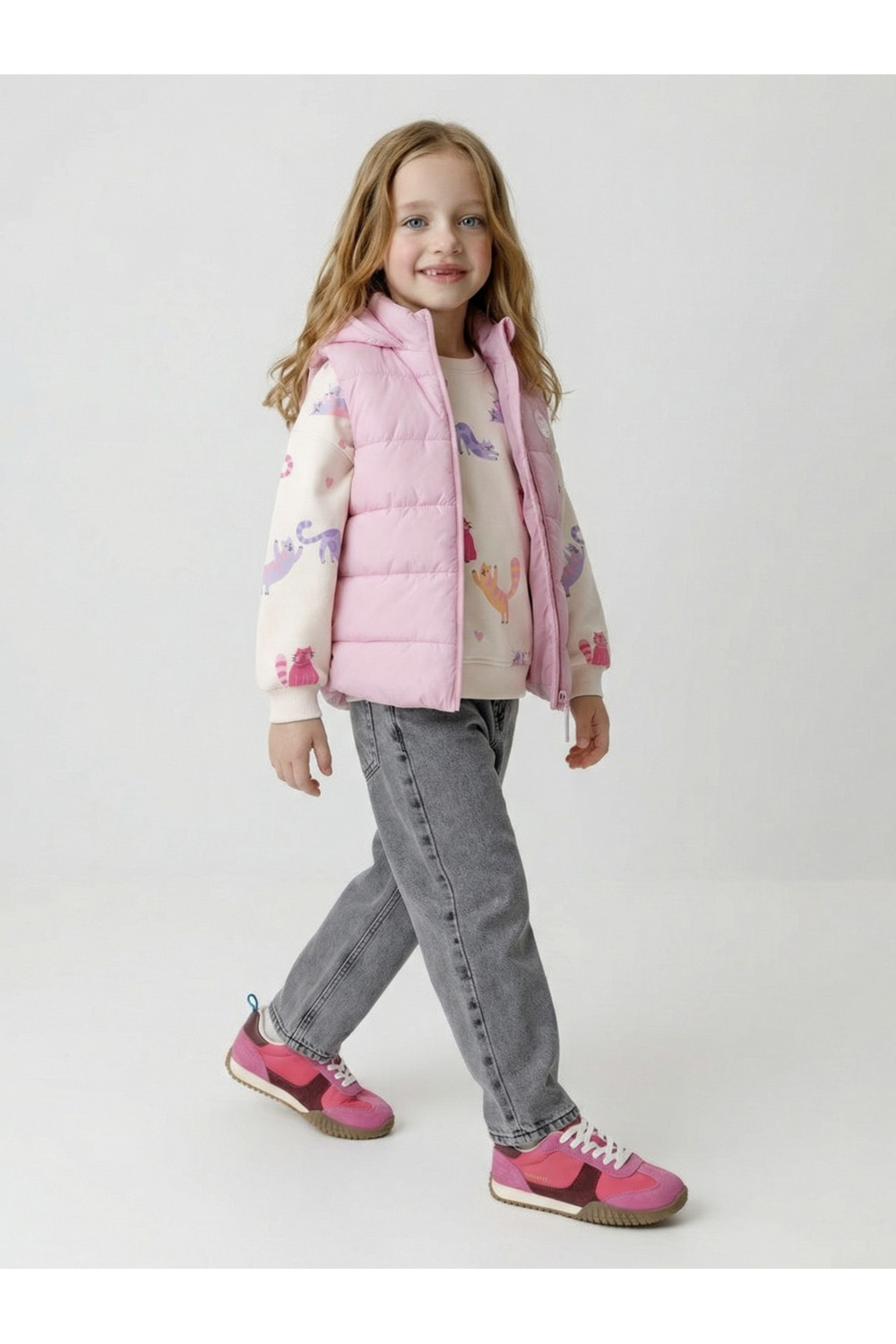 Стёганый жилет с капюшоном для девочки с утеплителем Fellex®, 120 г/м2. Выполнен из мембранной ткани с дополнительной тефлоновой обработкой. Данный вид обработки предохраняет изделие от загрязнения и лучше отводит влагу. Подклад из хлопка в размерах 86-92 и 92-98 и из полиэстера в размерах от 98-104 до 122-128. Капюшон не снимается, обработан по краю эластичным кантом для лучшего прилегания. Изделие застёгивается на молнию, предусмотрена защита подбородка. Два кармана по бокам без застёжек. Во всех изделиях верхнего ассортимента для безопасности ребёнка предусмотрены светоотражающие элементы.